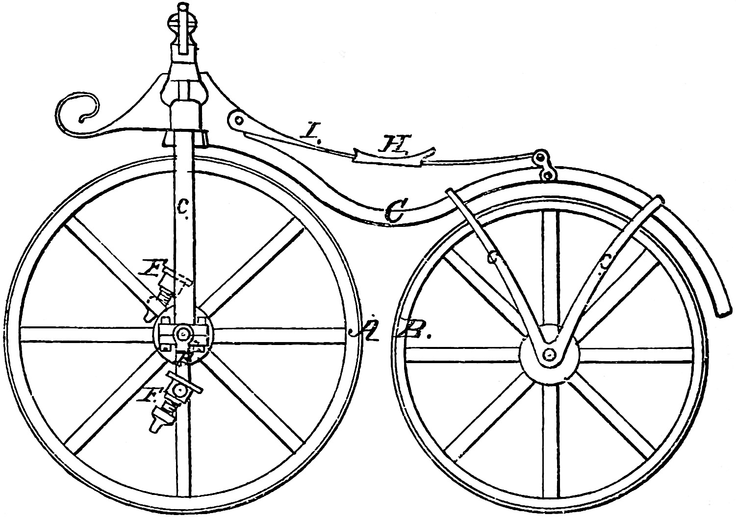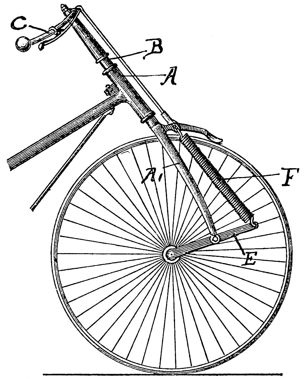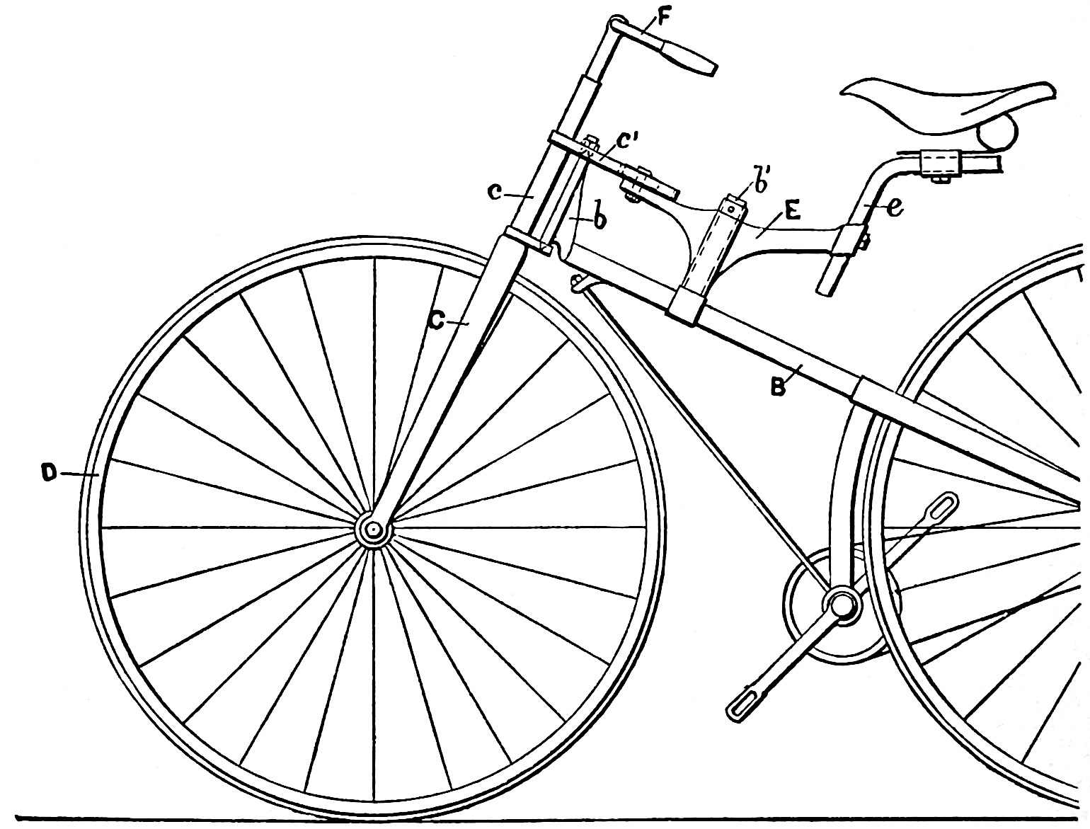 “In bicycles of ordinary construction, when the rider anticipates a fall it is customary to turn the steering-wheel in the direction towards which the rider is inclined to fall. When the steering-wheel of my improved velocipede is deflected, the saddle swings in an opposite direction to that in which the rider tends to fall, which enables the rider to regain his balance with very little movement of the steering-pivot, and also to maintain a direct course with greater ease than with the ordinary machines.”