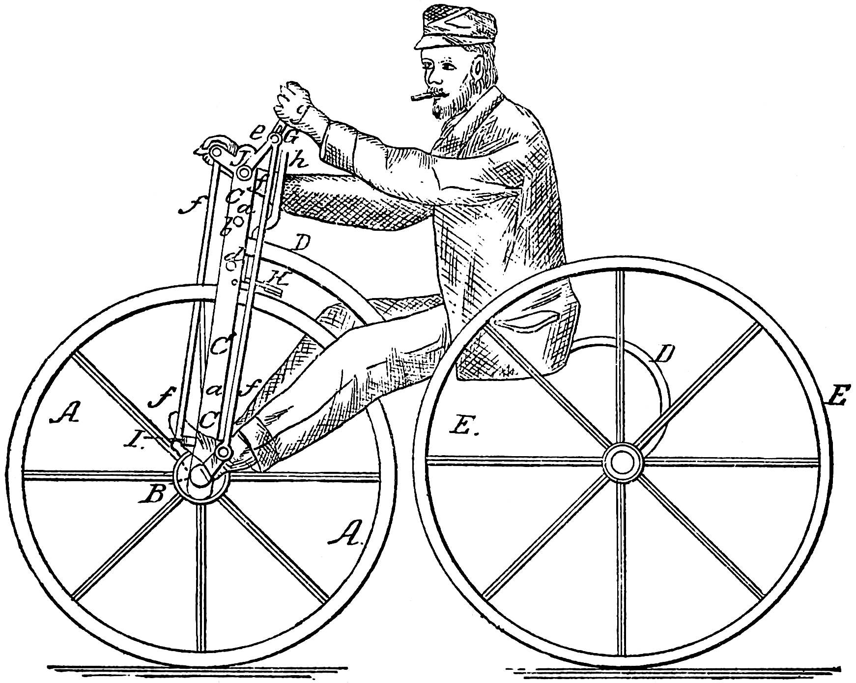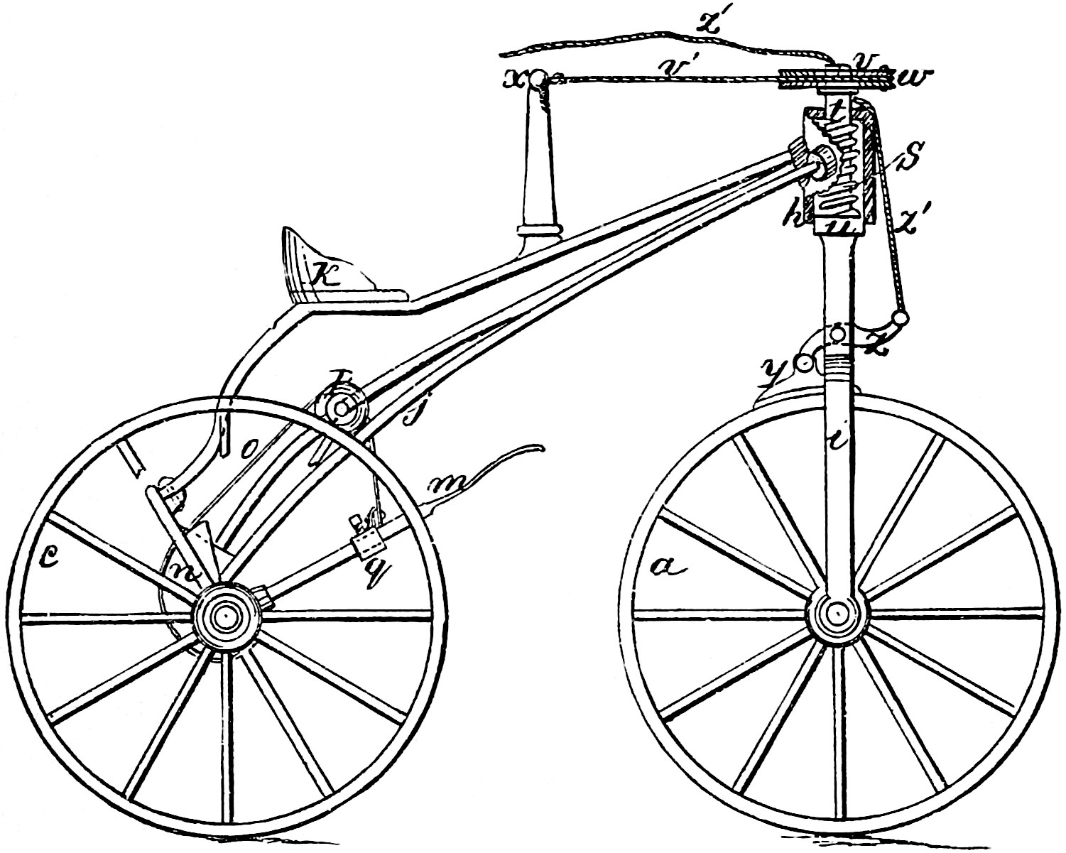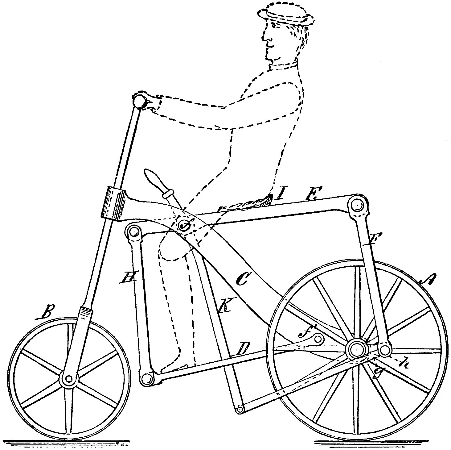 “In bicycles of ordinary construction, when the rider anticipates a fall it is customary to turn the steering-wheel in the direction towards which the rider is inclined to fall. When the steering-wheel of my improved velocipede is deflected, the saddle swings in an opposite direction to that in which the rider tends to fall, which enables the rider to regain his balance with very little movement of the steering-pivot, and also to maintain a direct course with greater ease than with the ordinary machines.”