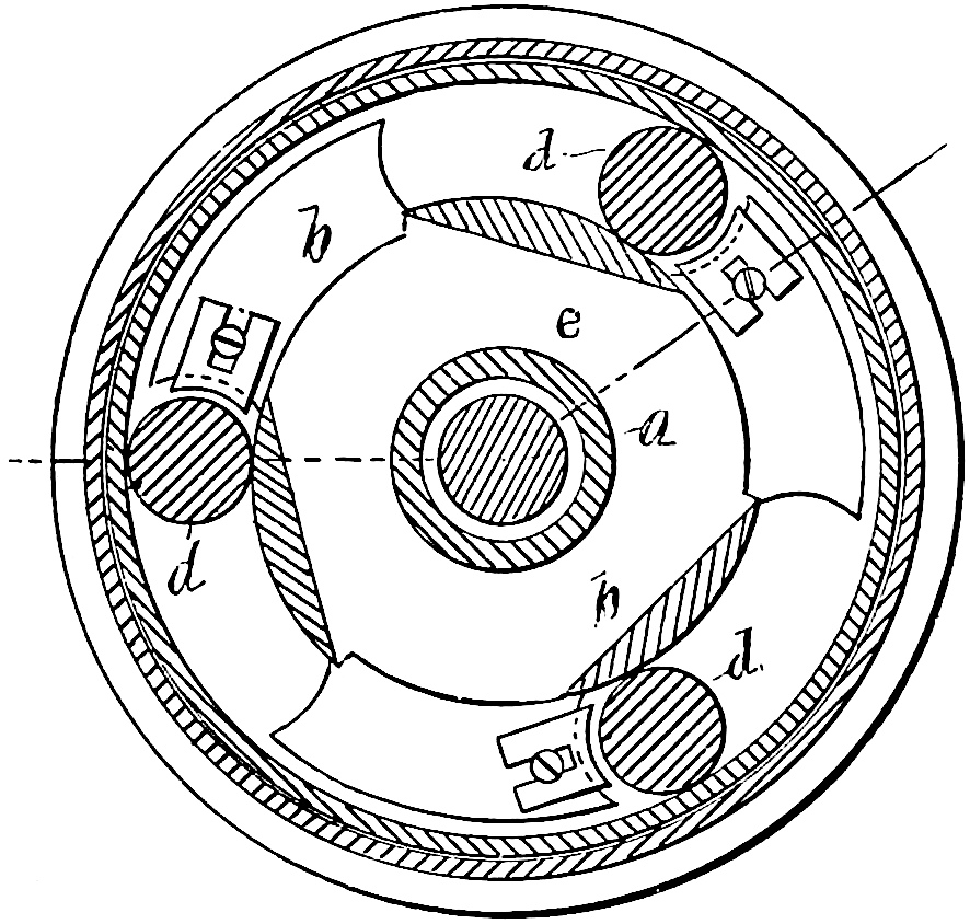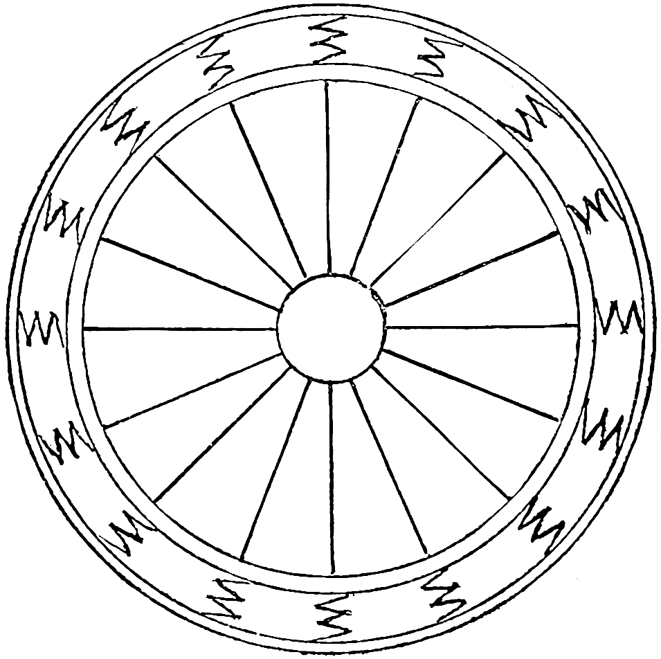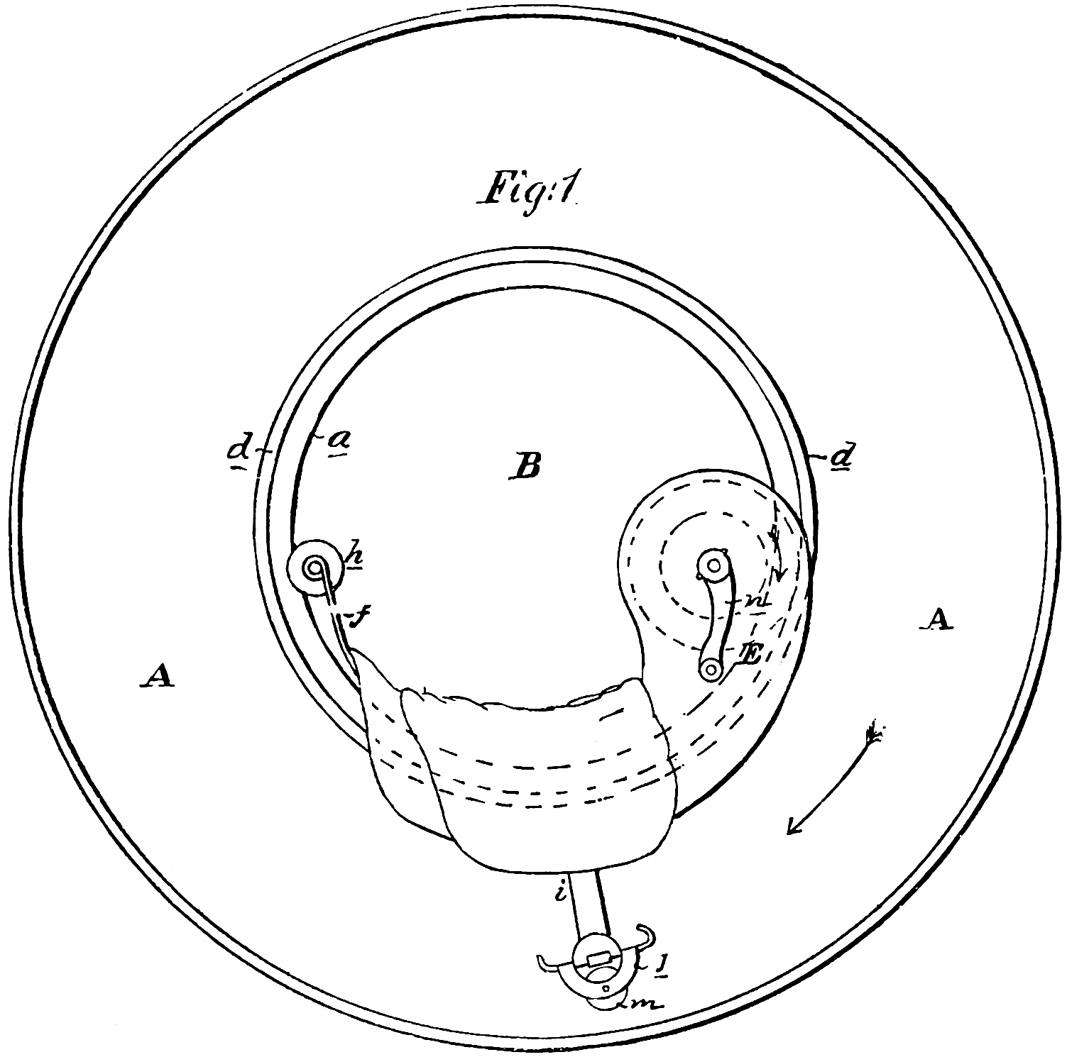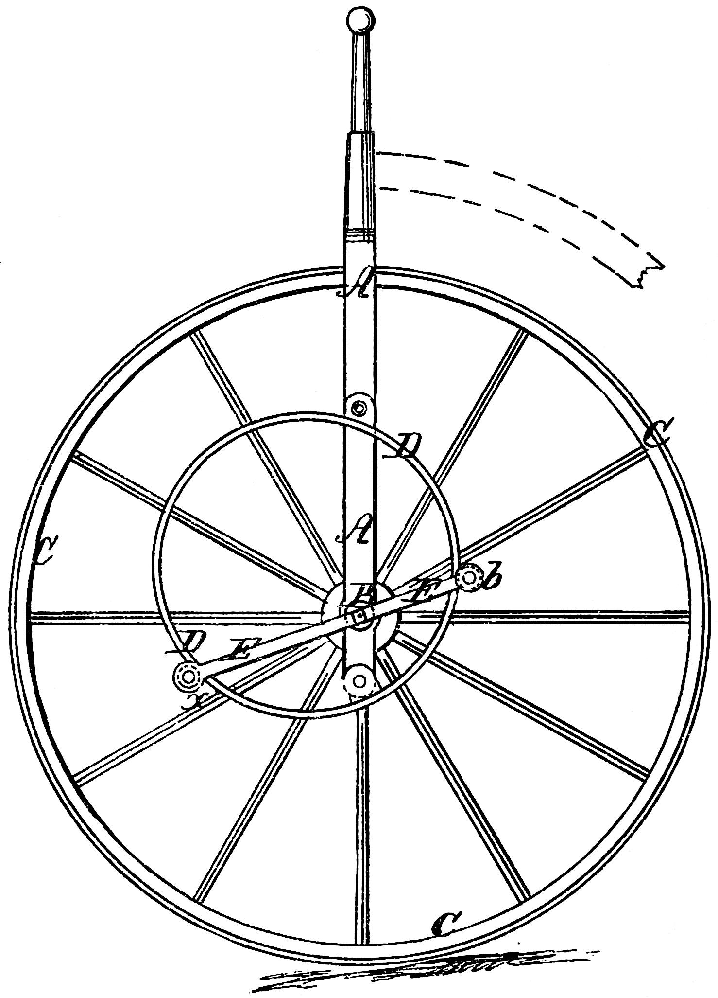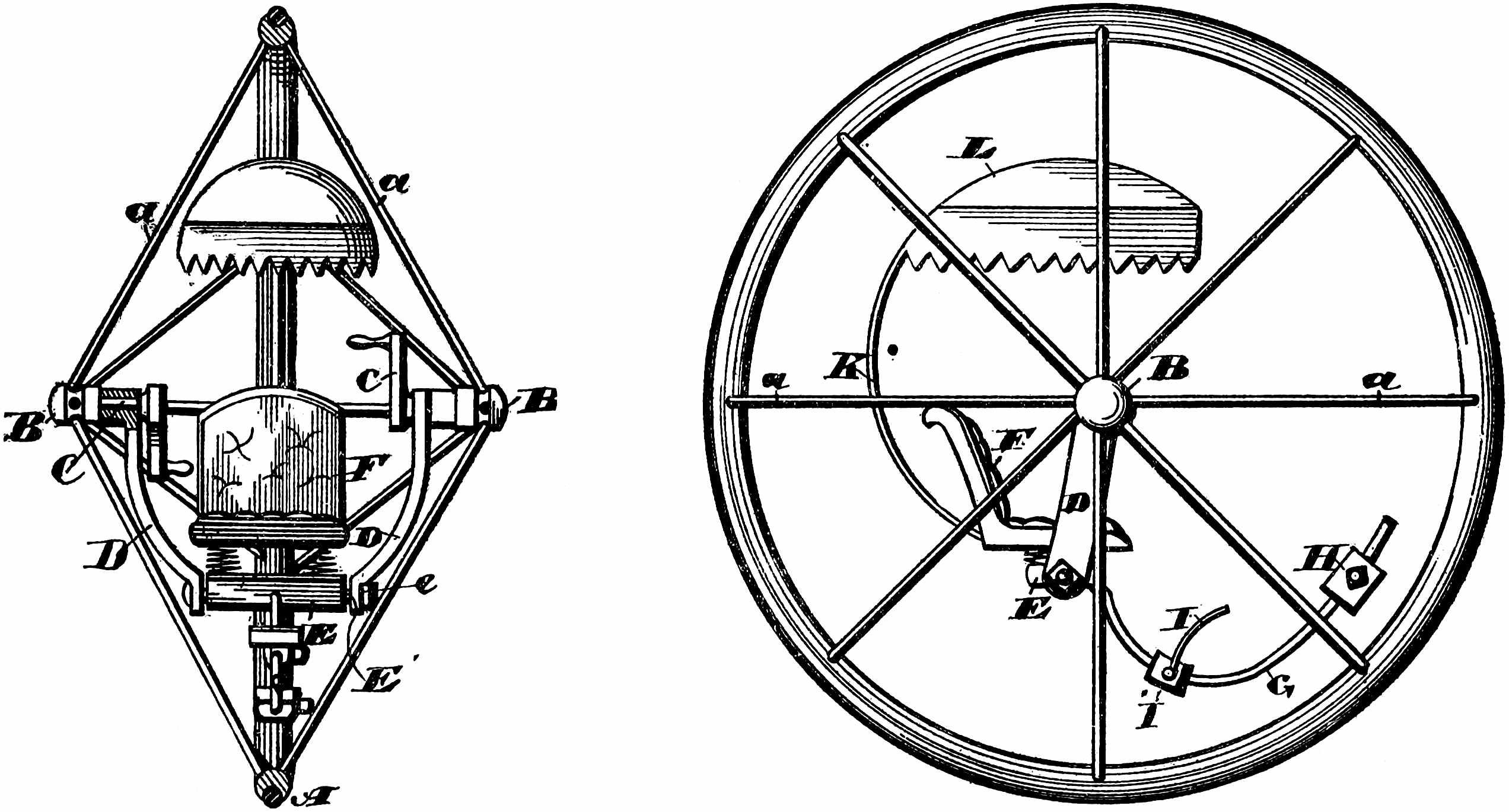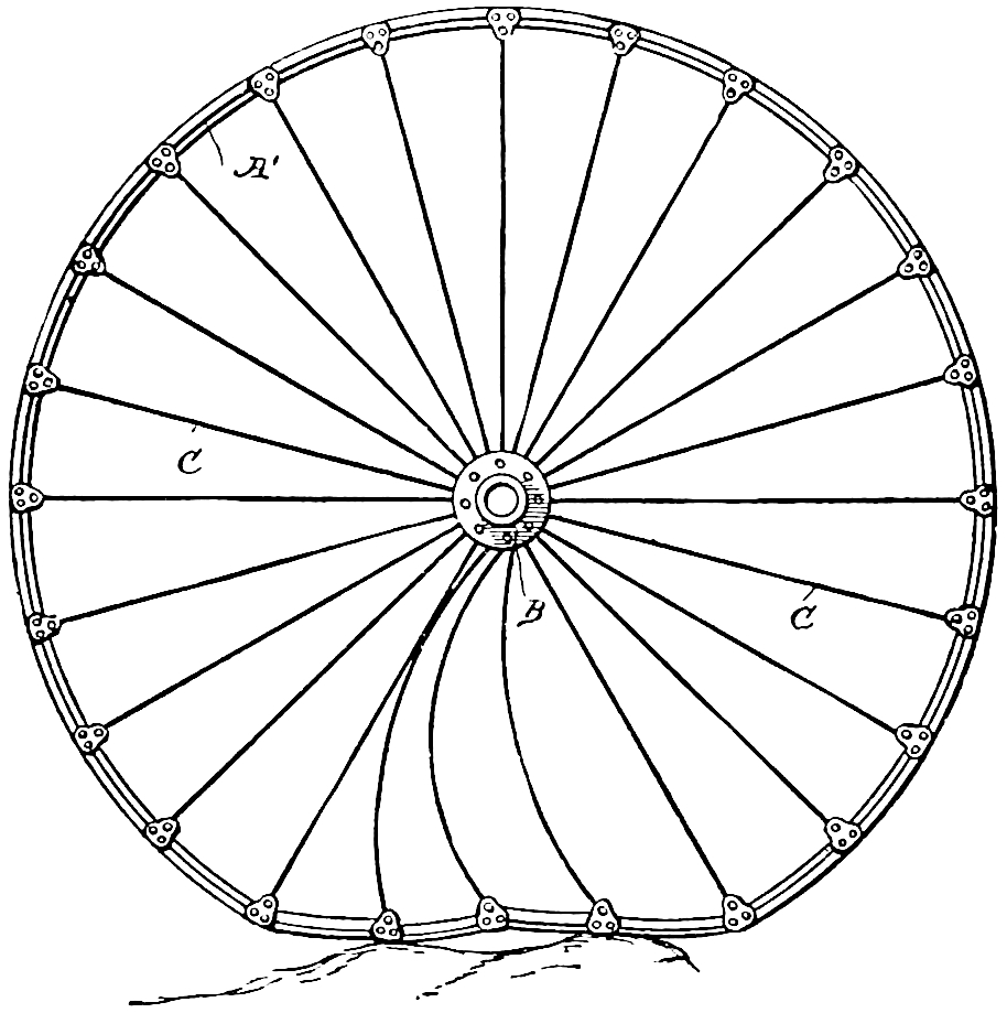 “To allow of entering the machine, a portion, c′, of one felly is made separate, and the hub a made with a hinged segment, a2, to which the spokes from the felly-segment c′ connect, so that the latter can be swung out.”
