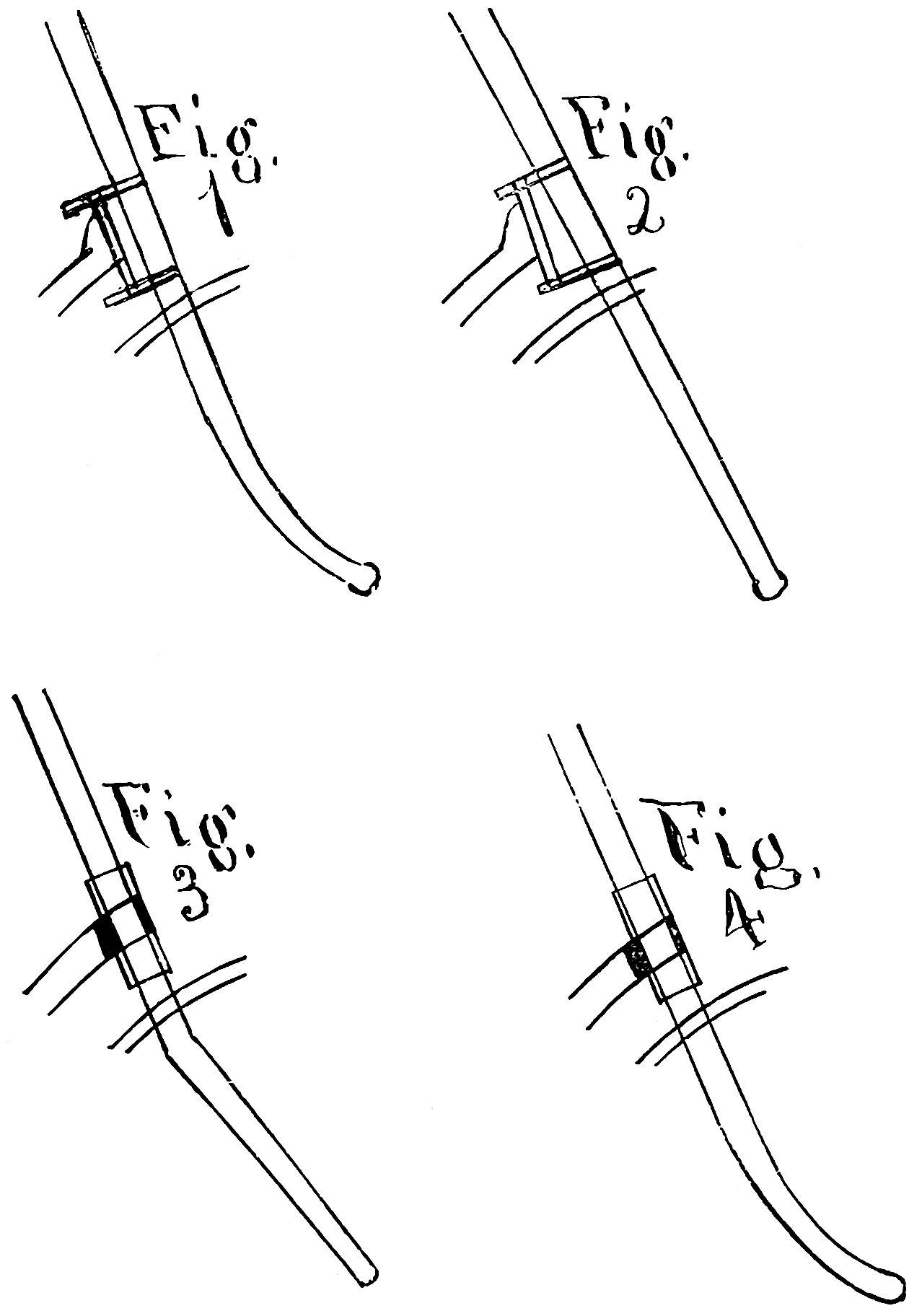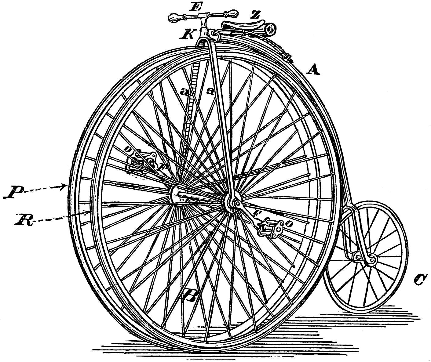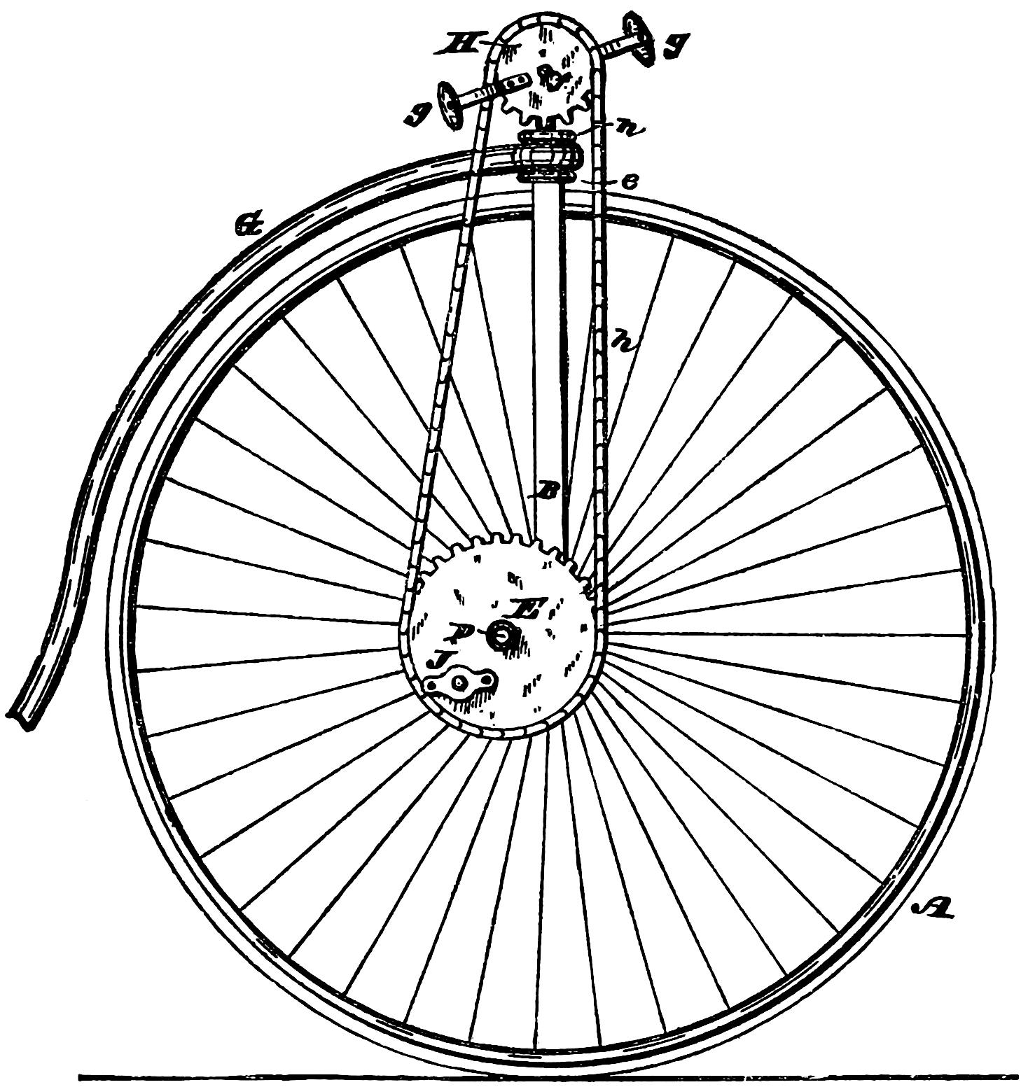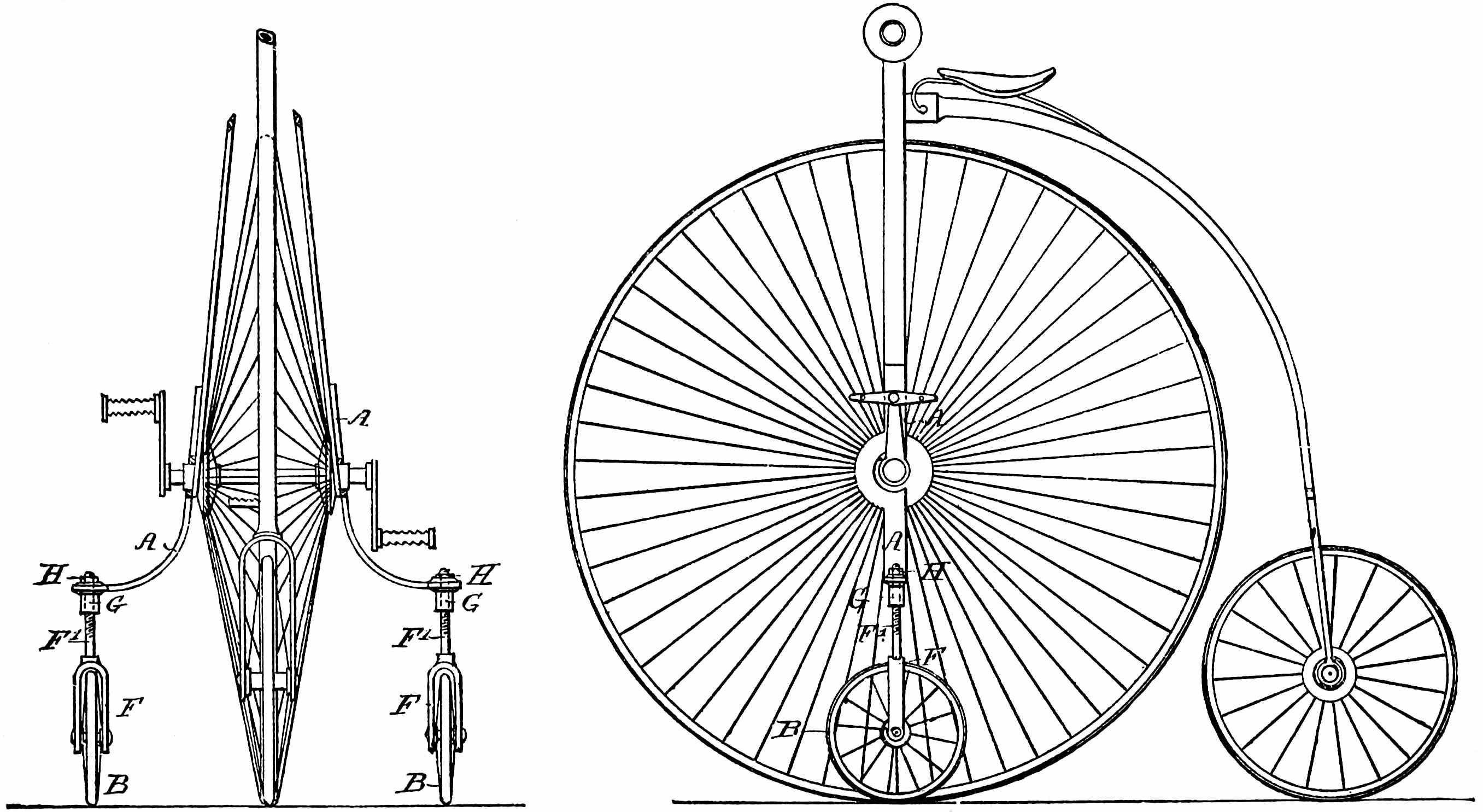 “The advantage of this form of handle-bars is that it enables the rider to mount from in rear of the large wheel in the usual manner, and to dismount either in the rear or in the front of the large wheel. It also permits of an upward pull upon the handle in propelling the wheel.