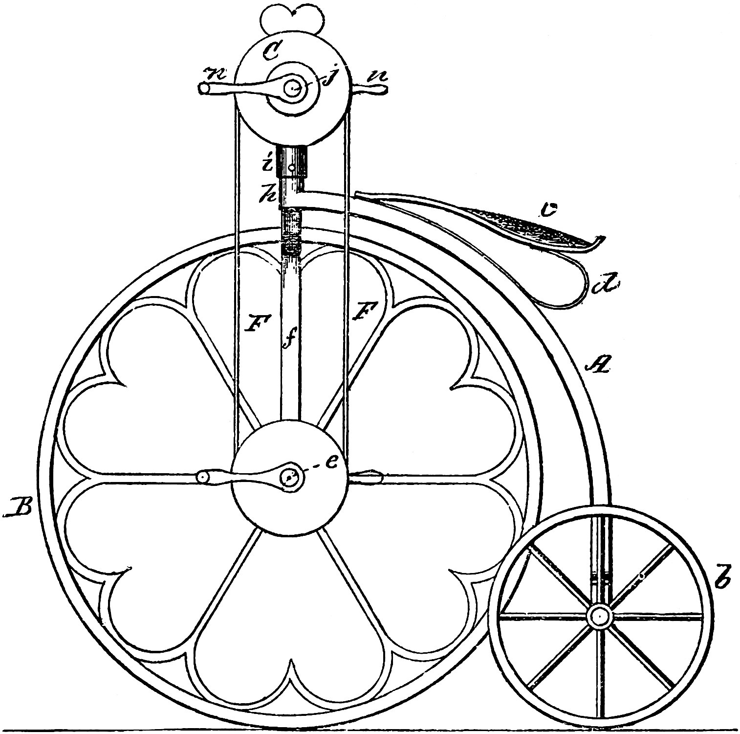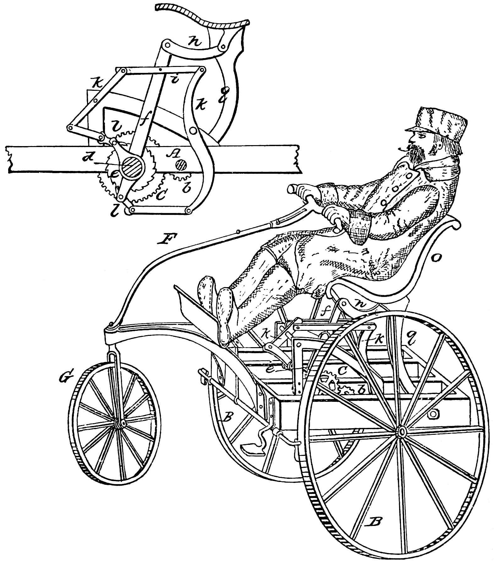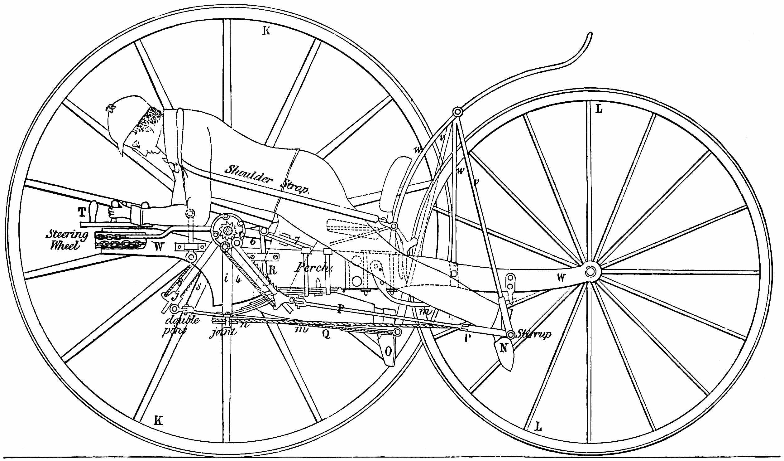 “This invention consists of the construction and arrangement, as hereinafter described, of a vehicle to be propelled and guided by the rider, the driving-power being applied by means of hand-cranks and the guiding being effected by the foot of the operator.