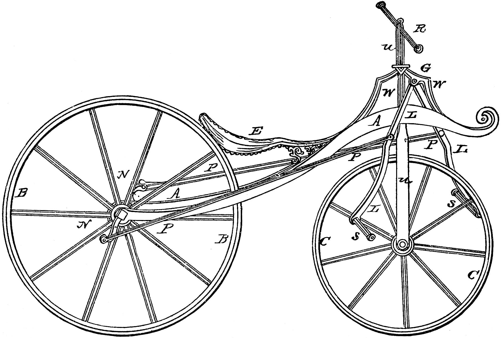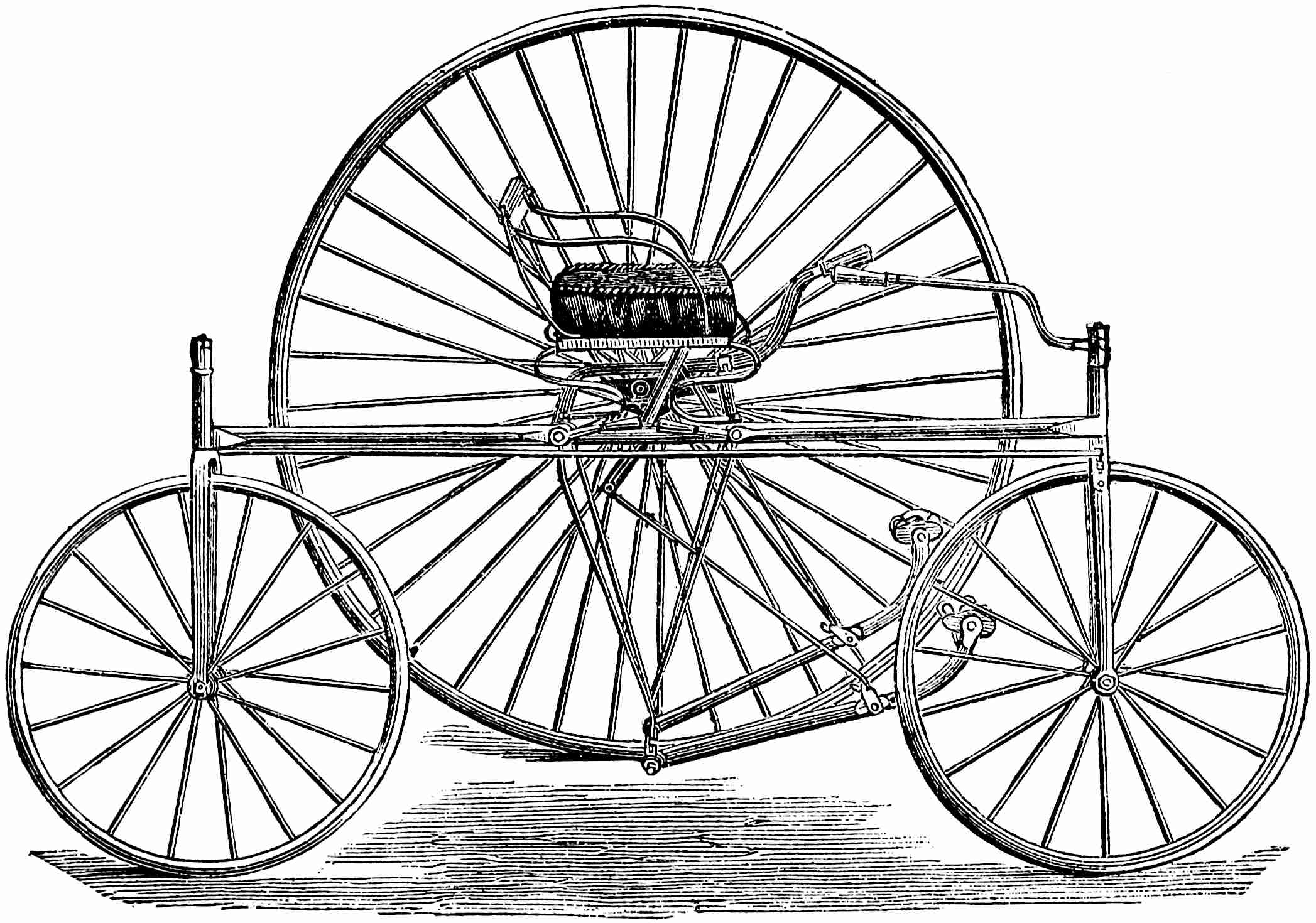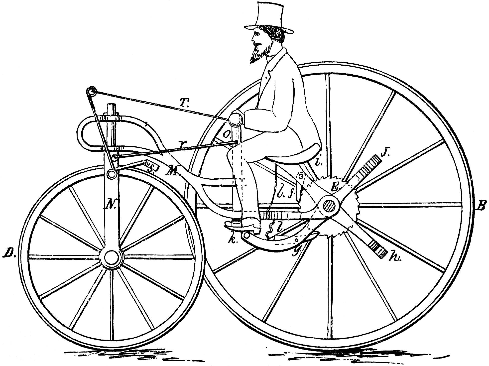 “This invention consists of the construction and arrangement, as hereinafter described, of a vehicle to be propelled and guided by the rider, the driving-power being applied by means of hand-cranks and the guiding being effected by the foot of the operator.