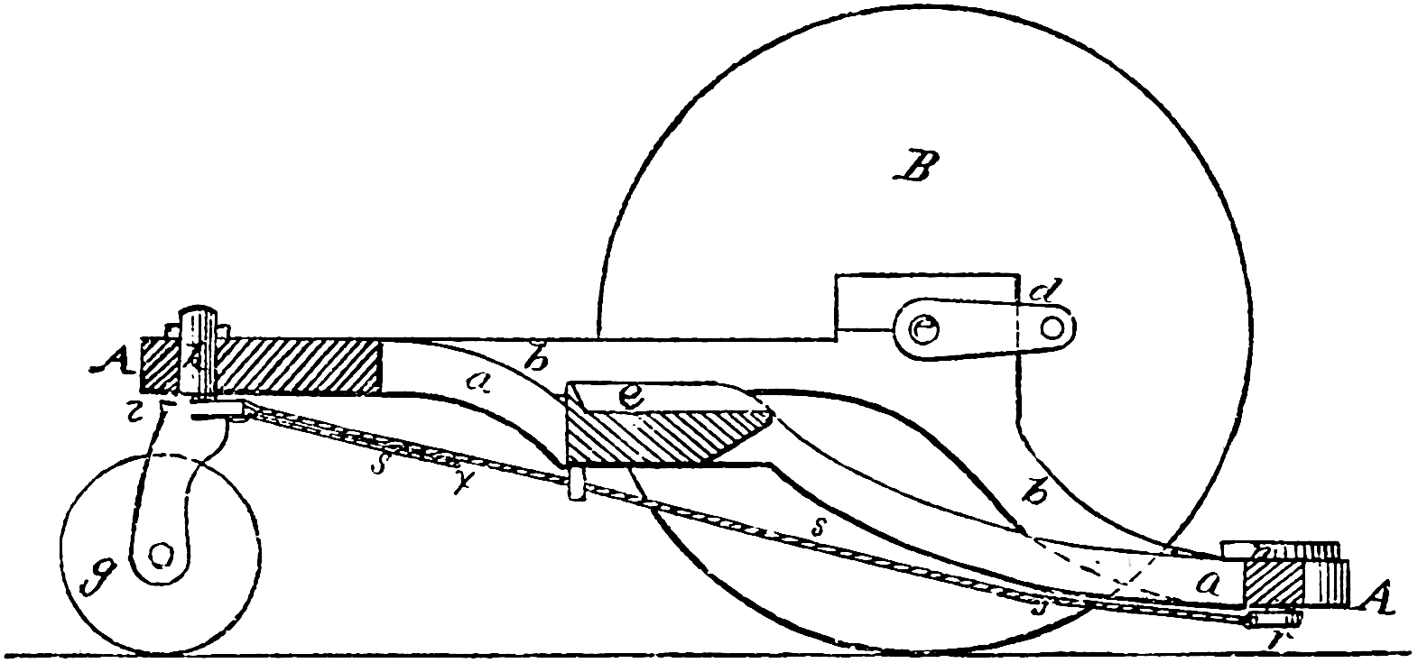 “When the machine encounters a stone or other obstruction, the frame M is moved rearwardly against the pressure of the spring L′, and thus causing the wheel B and the rider to be moved forwardly past the centre of the circular track for a corresponding distance, thus enabling the weight of the rider to be utilized in causing the circular track to pass over the obstruction.”