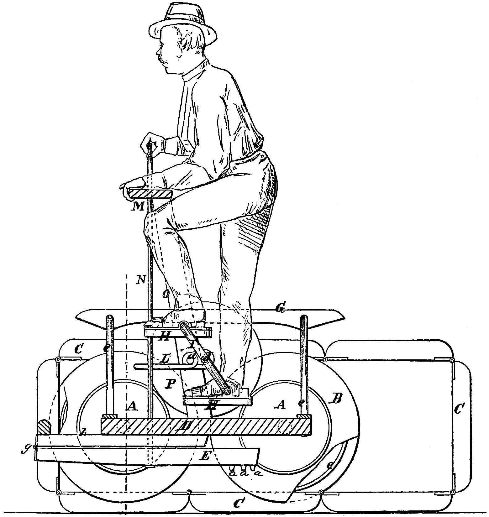 “The operation of this device is very simple. The operator seated within the machine operates the crank O of the shaft L, and the spur-wheels N, engaging with the spur-wheels I, move the vehicle forward. The steering-wheel C is operated by the feet in connection with the lever E.”