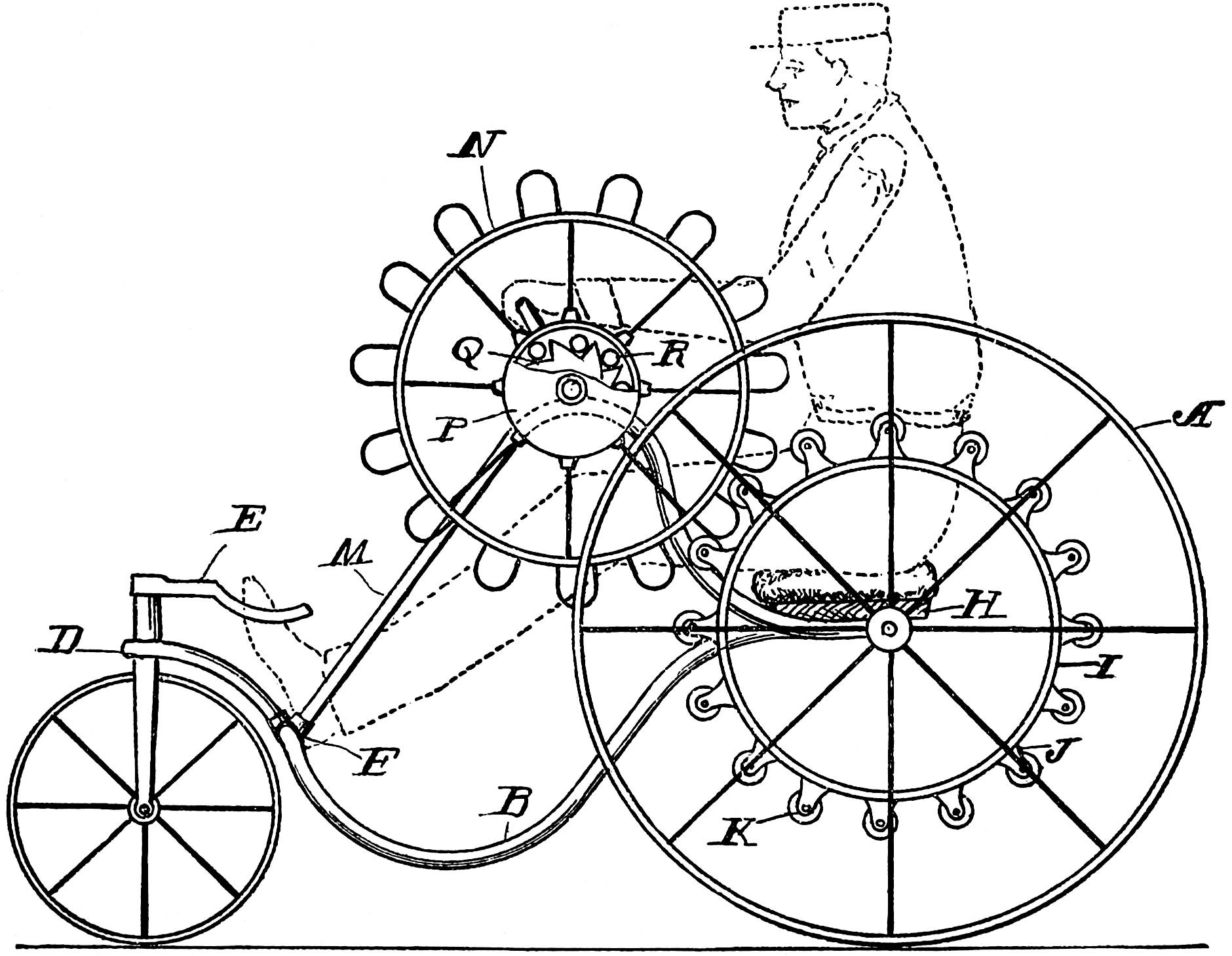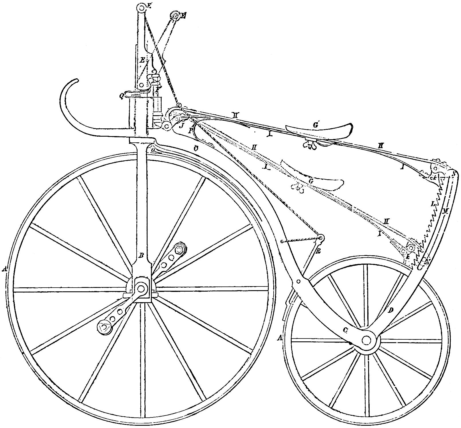 “A represents the hind axle, whereon the two hind wheels, B, are fitted by means of the well-known rose-clutch device C, the frame H, and turned by hand-cranks I, to be worked by the operator, who sits upon the saddle J.