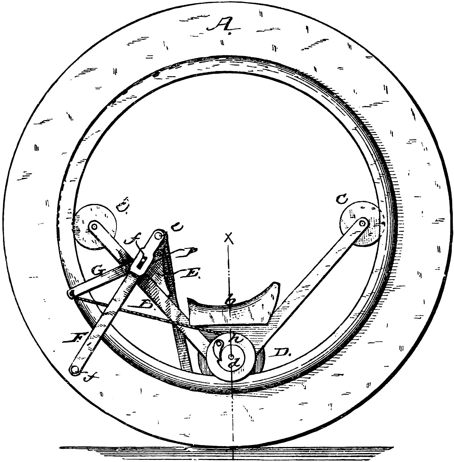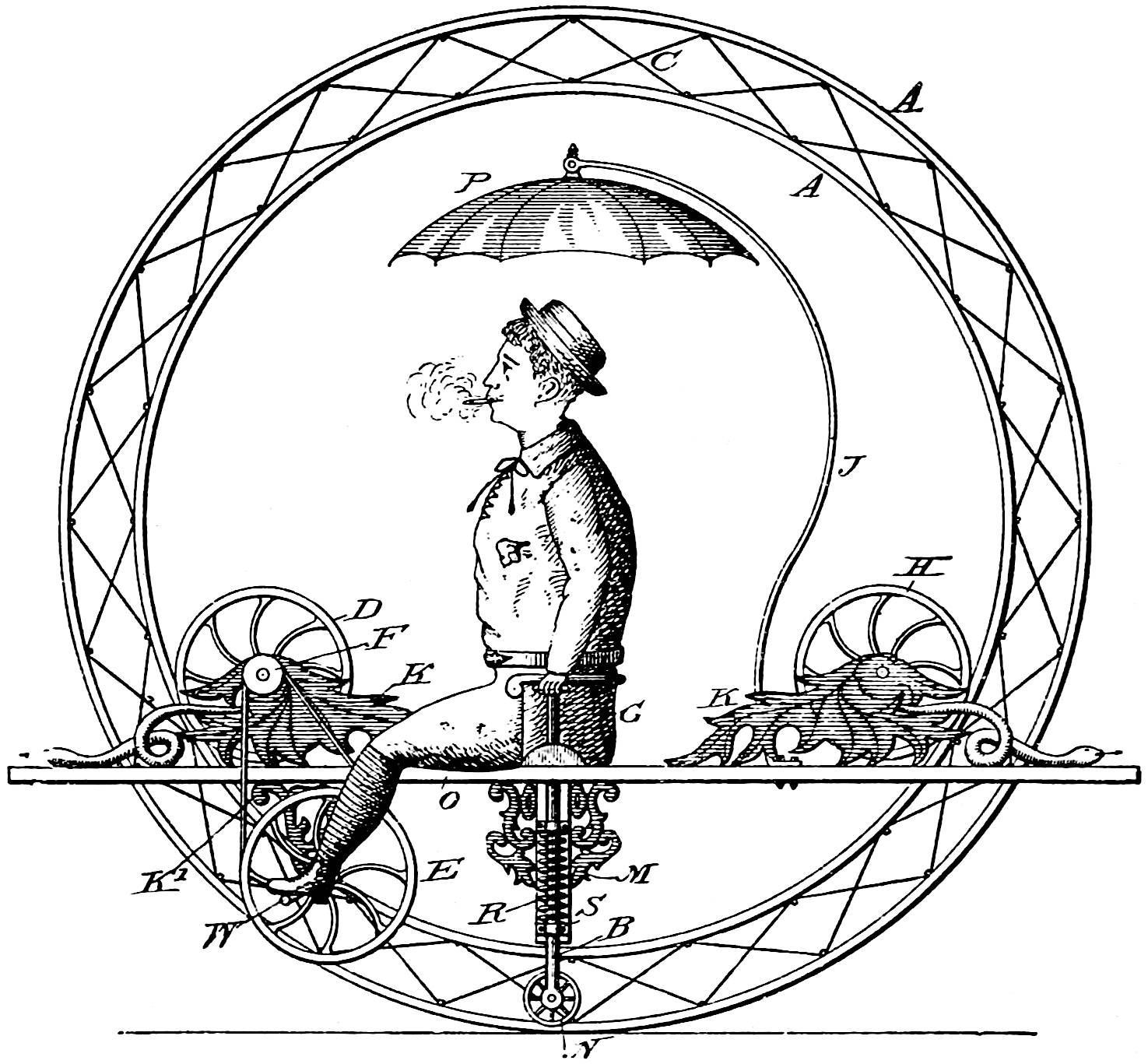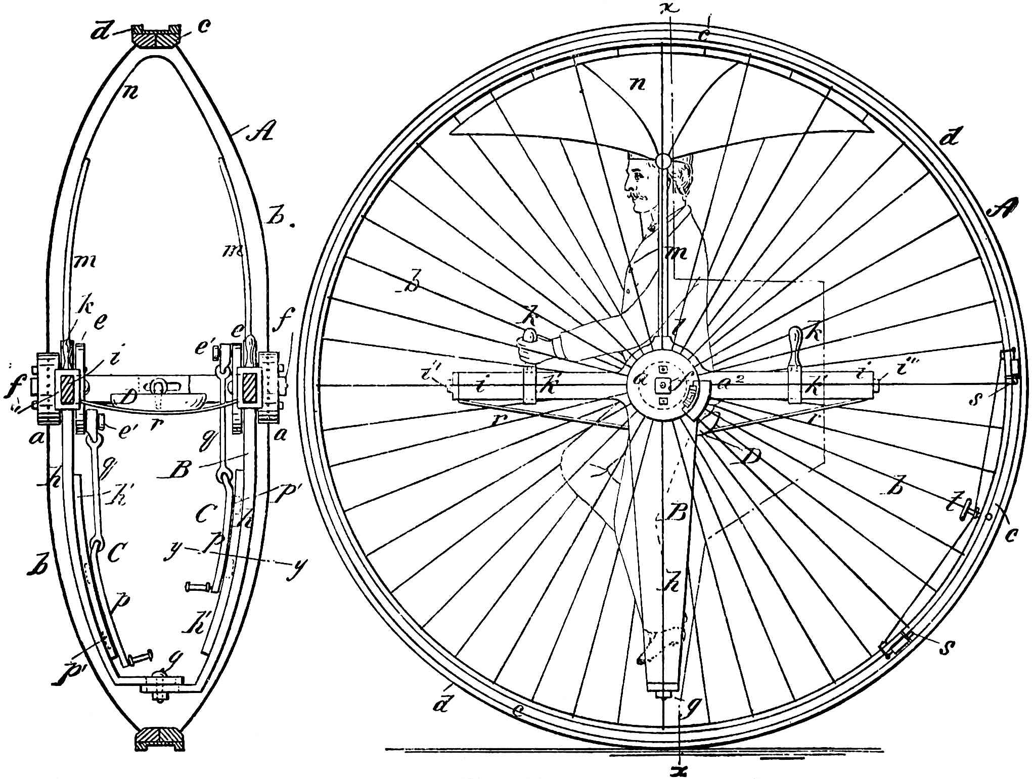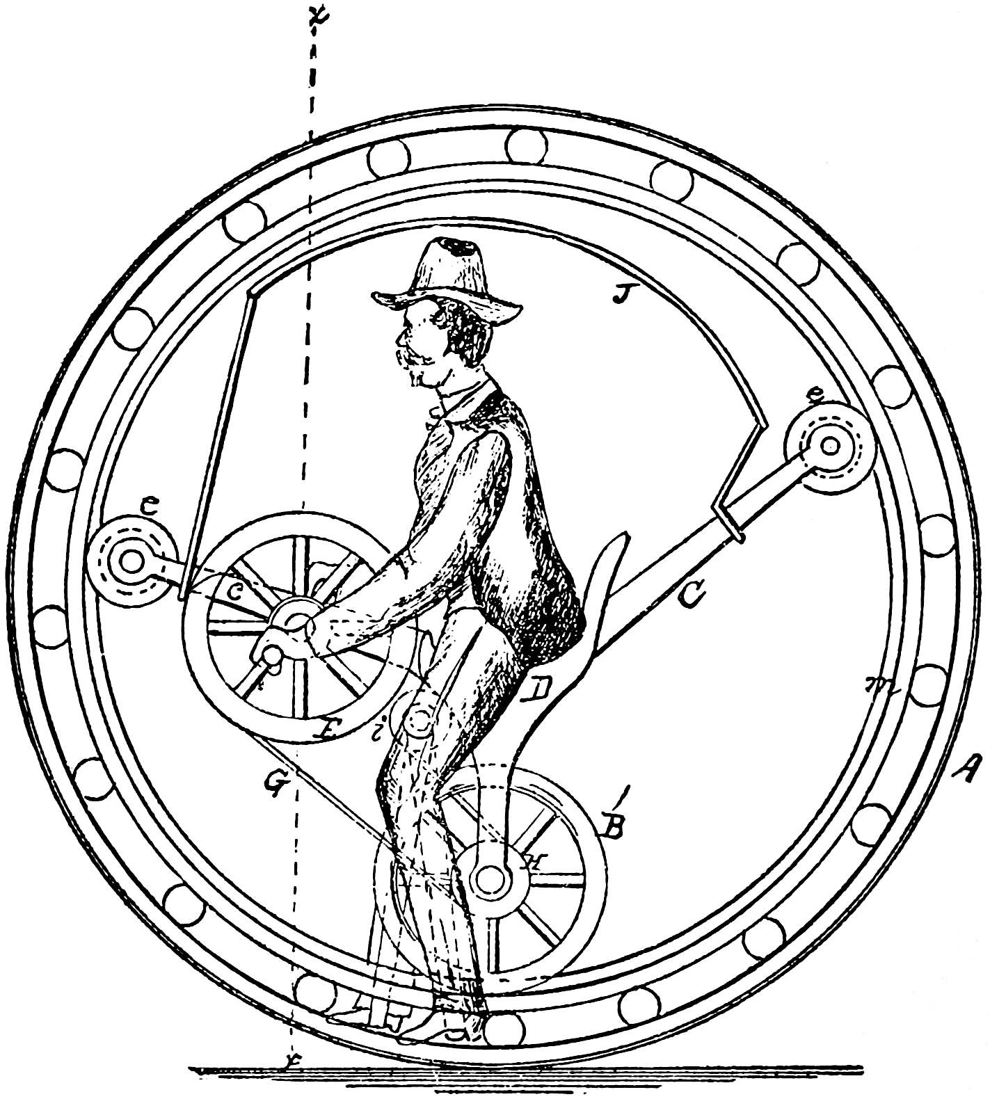 “My invention relates to a unicycle or one-wheeled vehicle, without spokes, which will carry one or more persons, as well as a bicycle or tricycle, and which is operated from within, carries the passenger inside, and only one wheel touching the ground. I attain these objects by the means of the devices illustrated in the accompanying drawings.