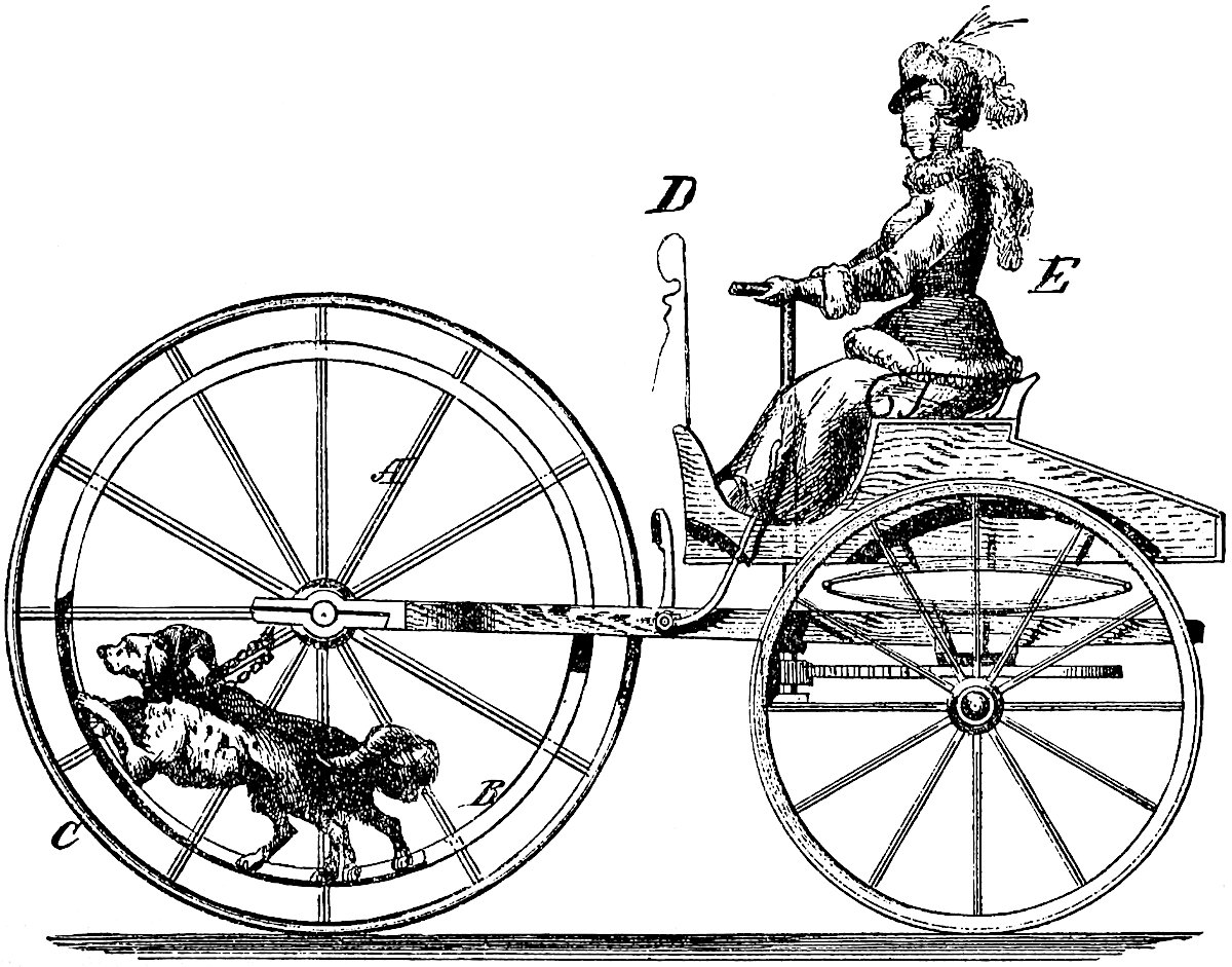 This device works entirely as a manumotor or hand-carriage. It is questionable if any prudent rider would care to be enclosed within this structure if there were many hills to descend. To be sure, if the seat gets fast, he can kick the spokes, as in the case of a squirrel and cage-reel, thus keeping himself upright, but this would be attended with great labor and requisite skill.