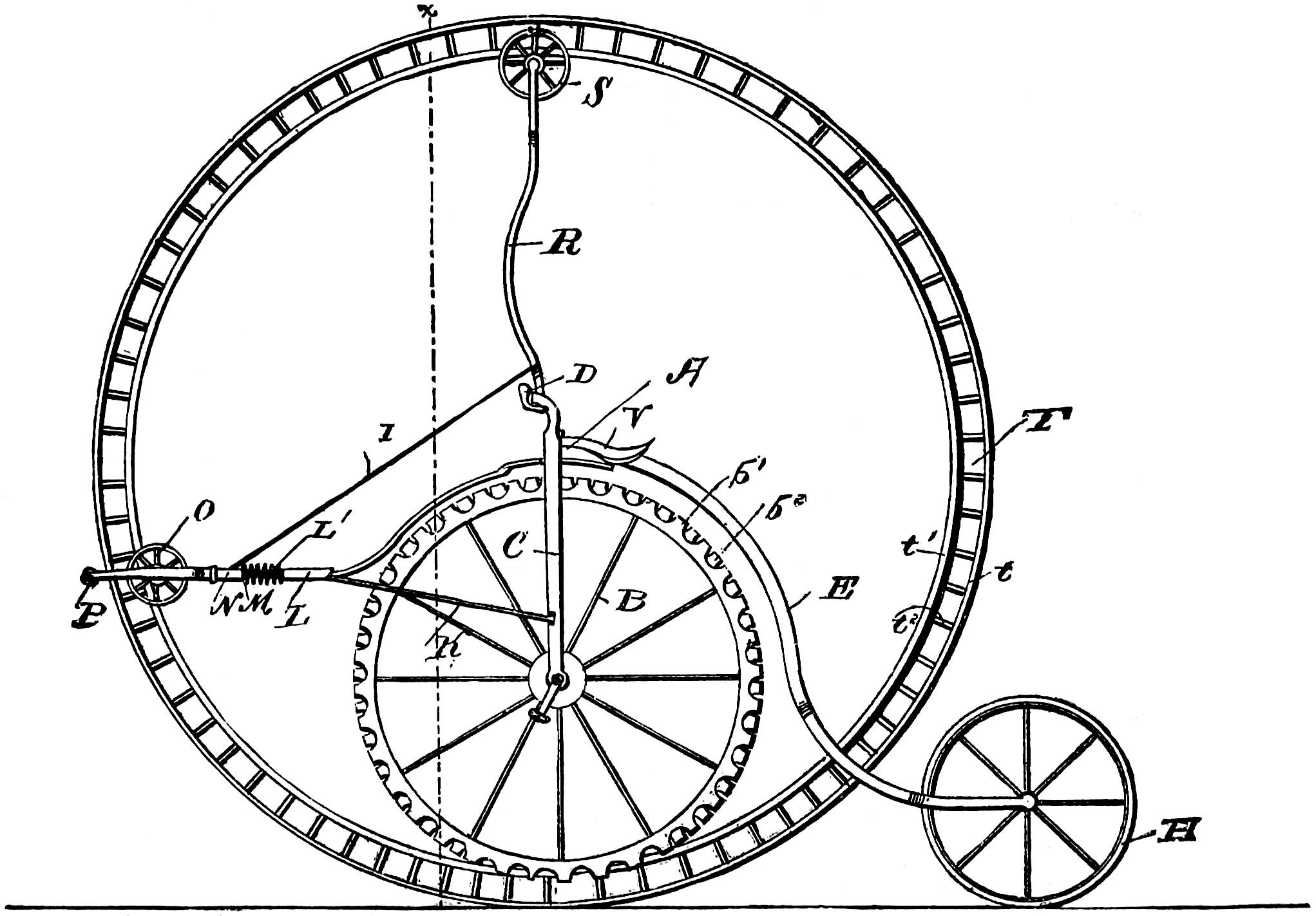 This patent is a fair sample of the big-wheel idea; it has some good features, such as the spring L′, which allows the inside machine, together with the rider, to swing forward when the outer wheel strikes an obstacle, thus acting as an anti-vibrator or momentum spring. The small inner wheel with cranks would make the machine run slow, but the appearance of the thing would be, I think, rather unique.