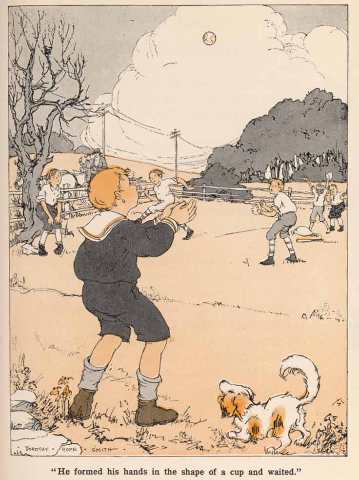 But it was Fall now, and the hill had turned brown. Over it he could see little figures moving. He looked at them very carefully, with one eye shut to see them the better. Then he decided that the bigger ones were men on horses, the little ones dogs. They all looked tiny because they were so far away.