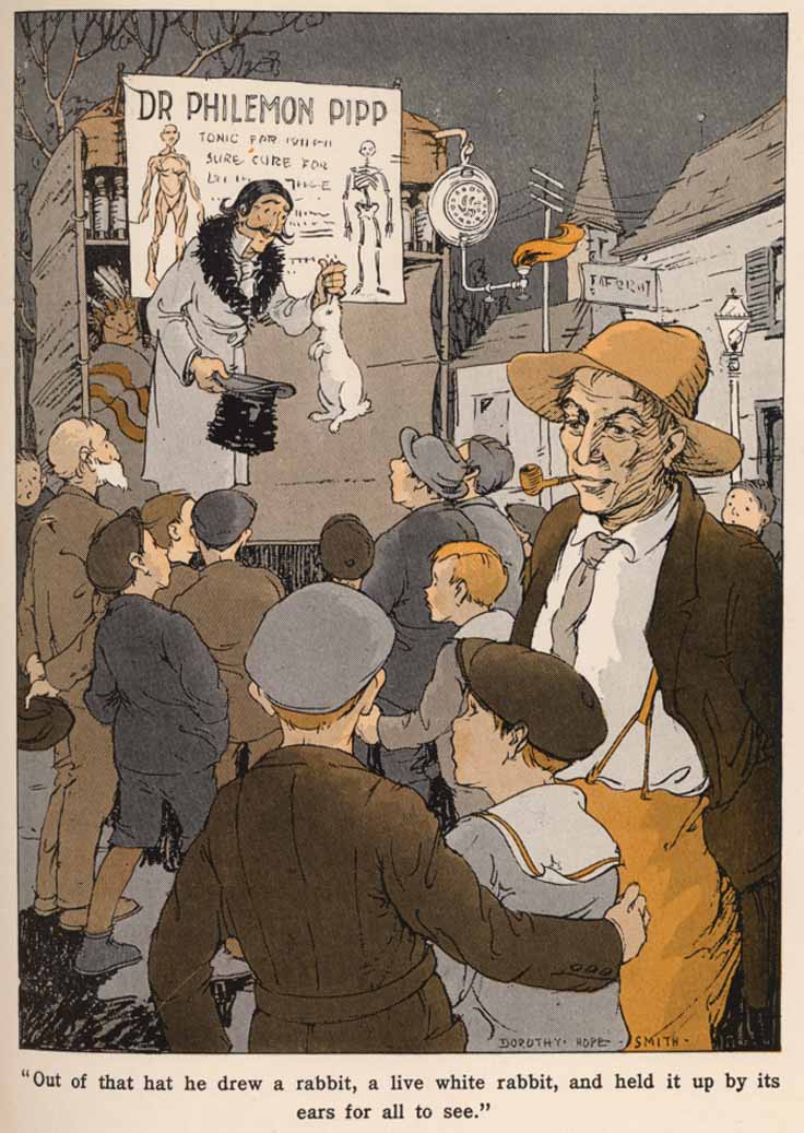 "OUT OF THAT HAT HE DREW A RABBIT, A LIVE WHITE RABBIT, AND HELD IT UP BY ITS EARS FOR ALL TO SEE"