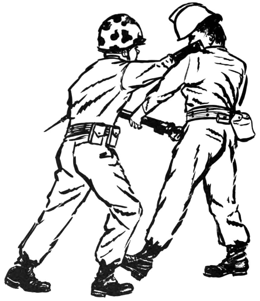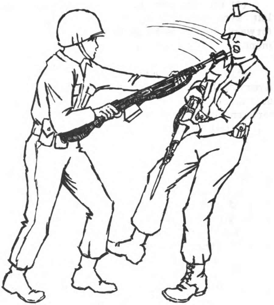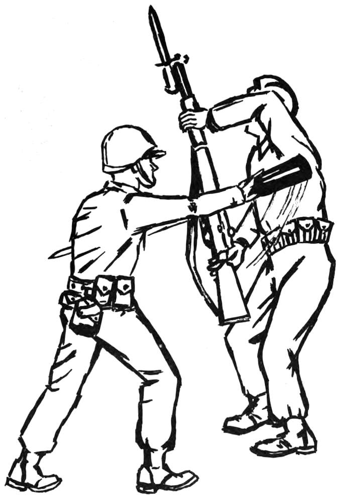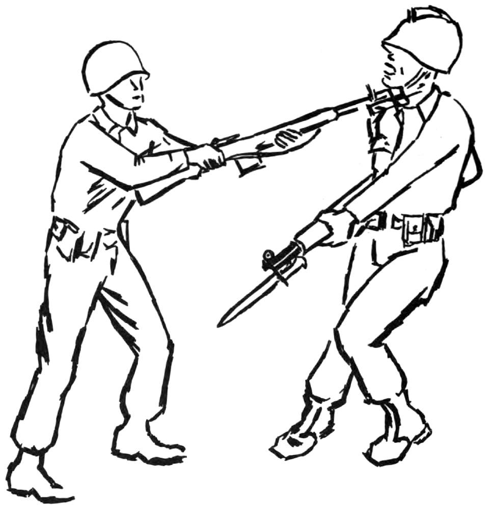 (c) Assumption of a vicious, aggressive attitude was the “spirit of the bayonet.” An actual bayonet fight was depicted as lasting only a few seconds during which time the bayonet fighter was to kill his opponent or be killed himself. The necessity for aggressive action was as obvious then as it is today. The enemy was to[Pg 7] be forced on the defensive; the battle was won if this was achieved. The attack consisted of a succession of thrusts, cuts, feints, and butt strokes delivered in succession and without pause, so as not to allow the opponent to recover.