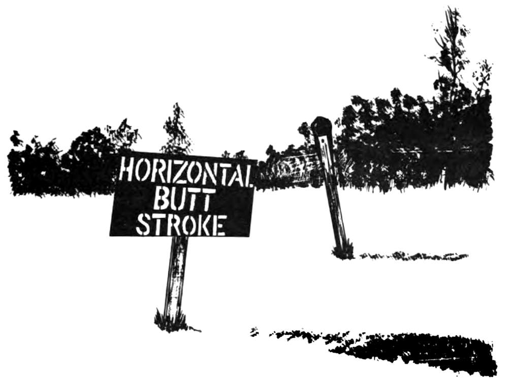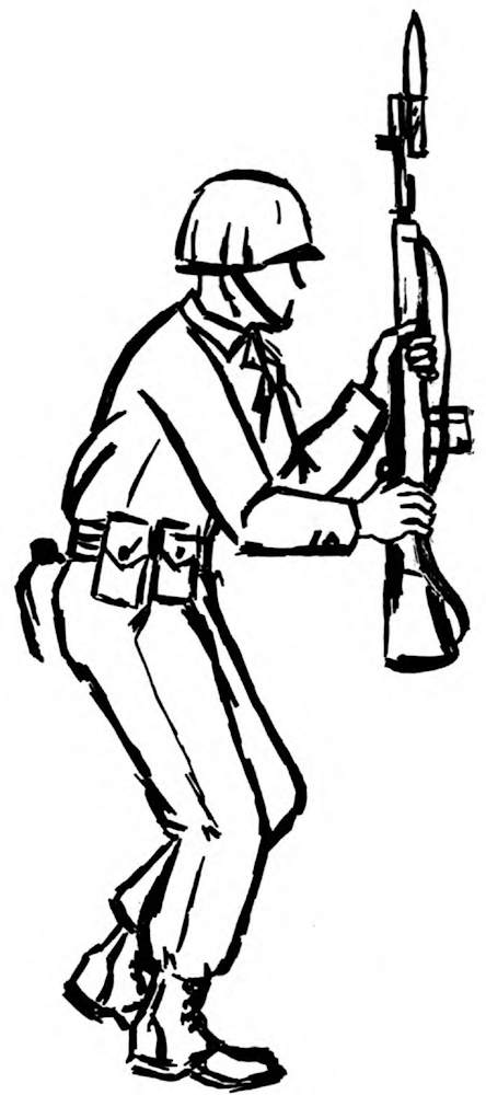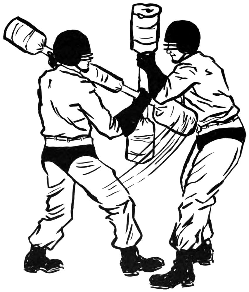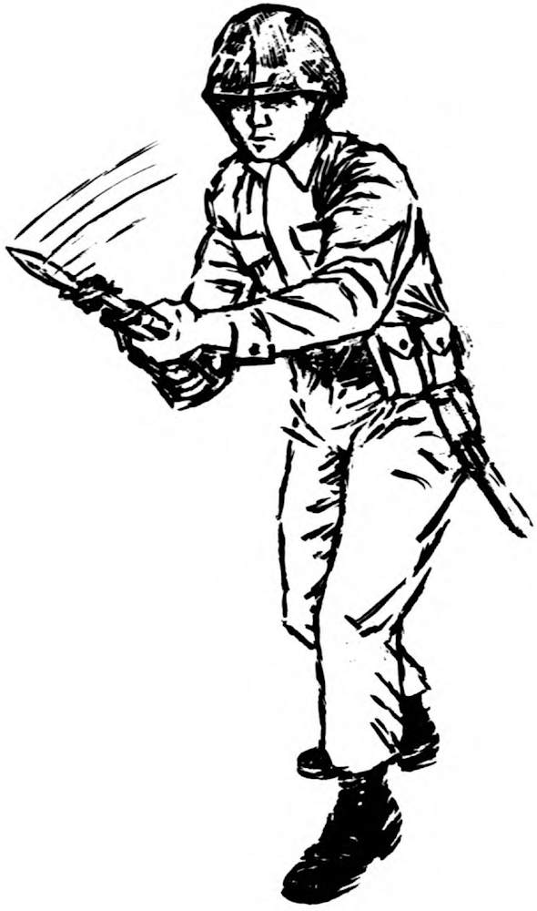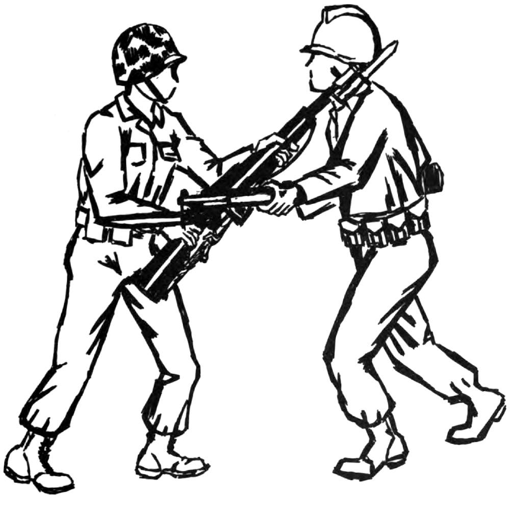 (c) Assumption of a vicious, aggressive attitude was the “spirit of the bayonet.” An actual bayonet fight was depicted as lasting only a few seconds during which time the bayonet fighter was to kill his opponent or be killed himself. The necessity for aggressive action was as obvious then as it is today. The enemy was to[Pg 7] be forced on the defensive; the battle was won if this was achieved. The attack consisted of a succession of thrusts, cuts, feints, and butt strokes delivered in succession and without pause, so as not to allow the opponent to recover.