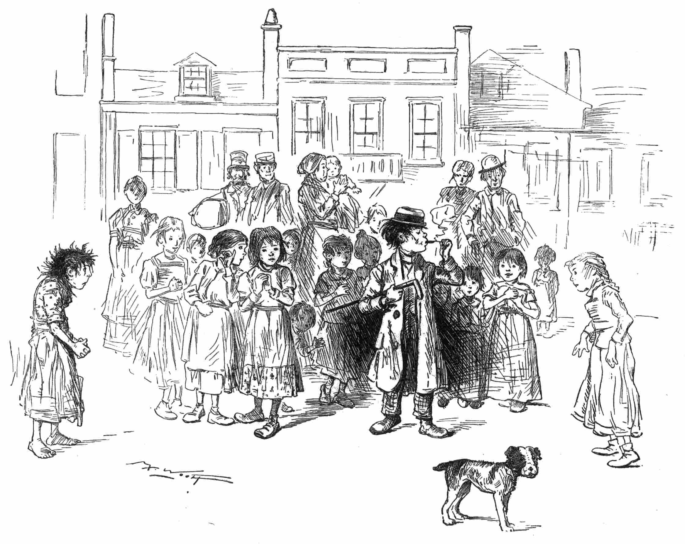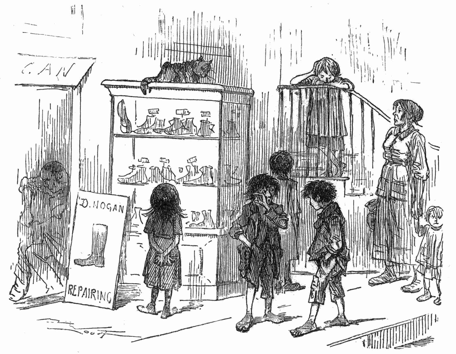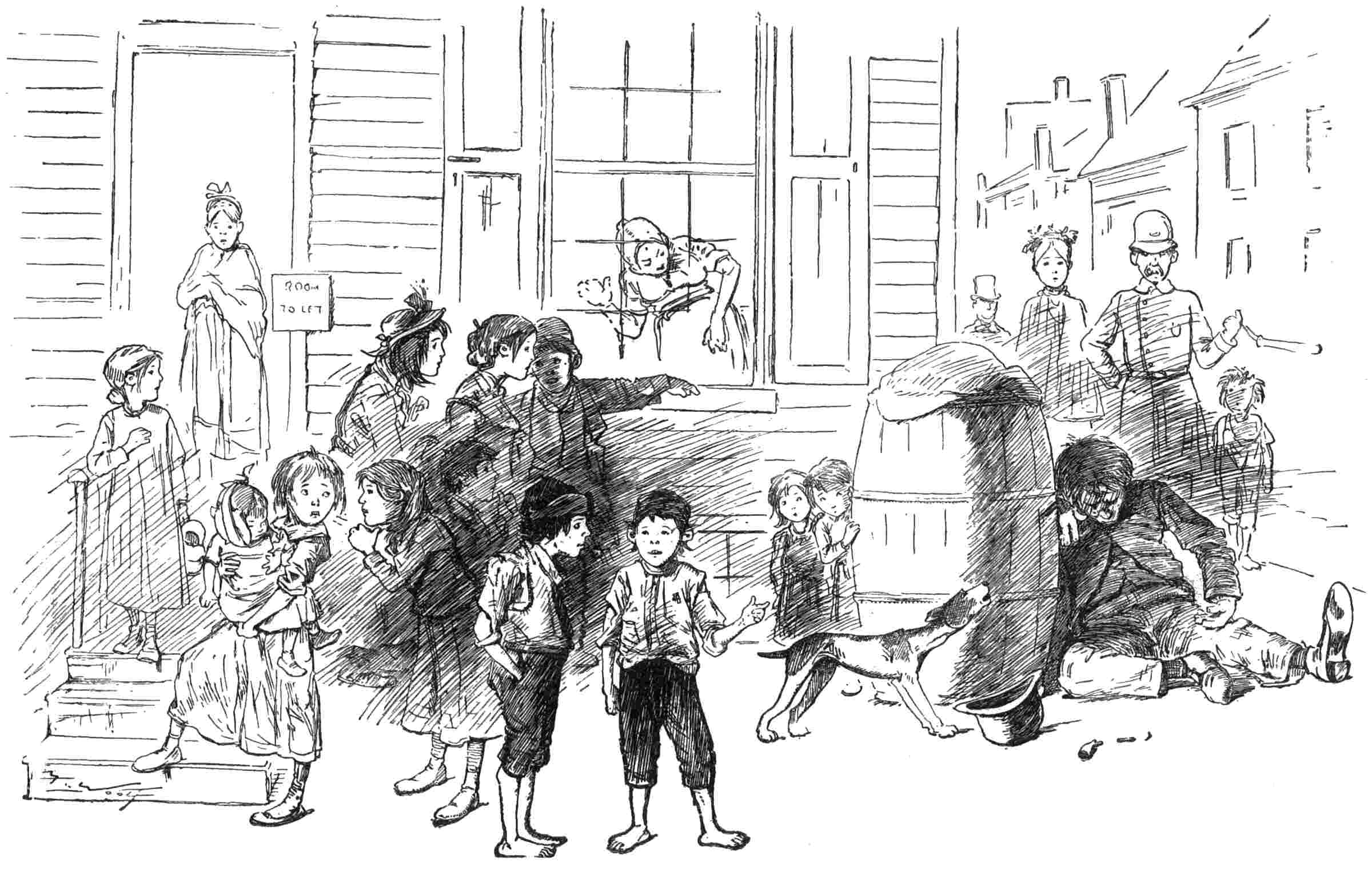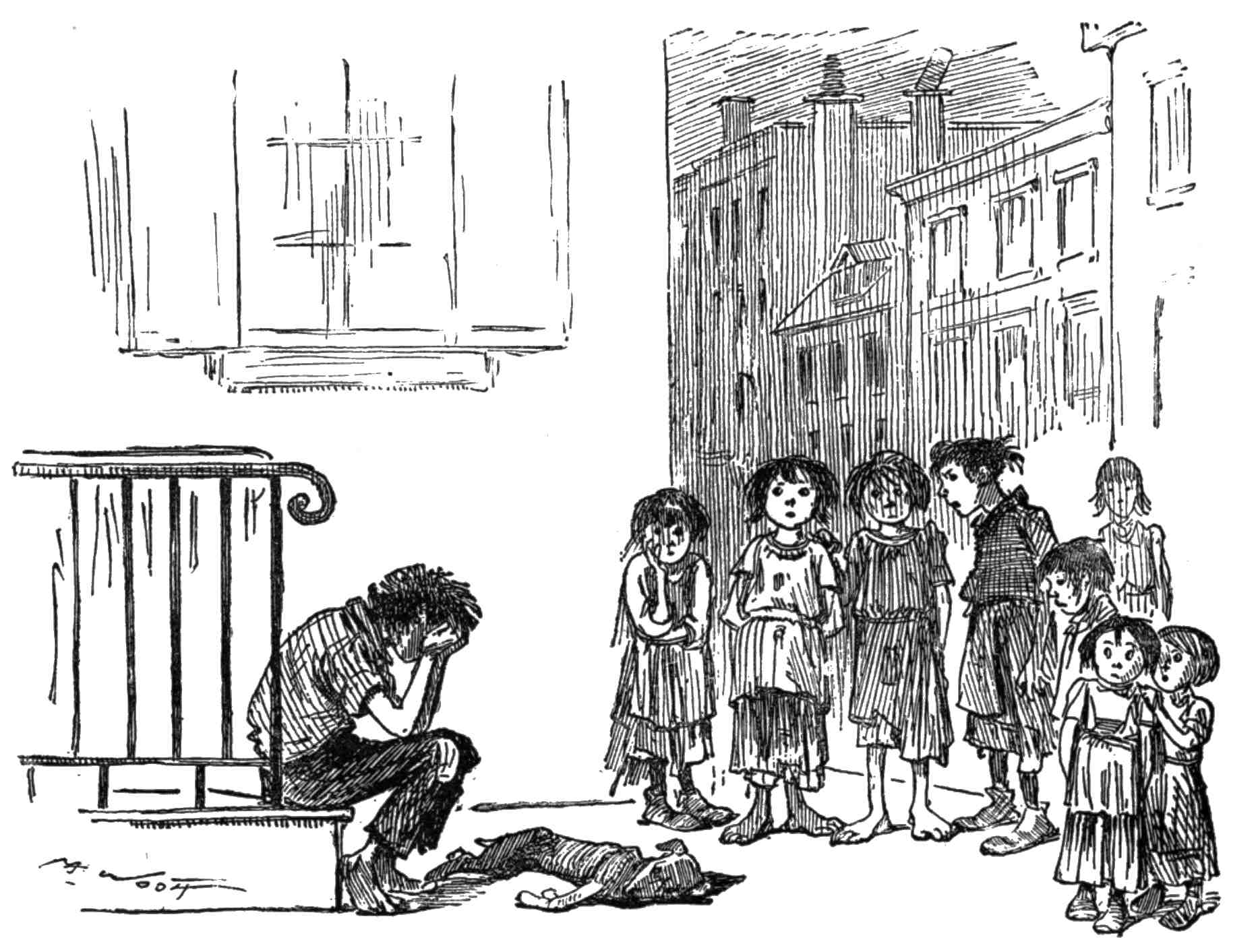 “Fellers! De gang has lost its pup! He scrapped wid a bull tarrier, an’ got it in de neck. He wuz a torrowbred, a chim dandy; a t’ree-times winner way up to de limit. He had a head on to him wot wuz almost hooman. I ain’t a-talkin’ troo me hat; I ain’t a-givin’ guff; I’m a-givin’ it to yer straight—he wuz a corker. Der Wanderbilts or Asters didn’t have de plunks ter buy dat pup—dat’s straight. He wuz way up in G—are yous wid me? His deat’ has broke me up; don’t jolly me—not on yer life. Yous wot has lungs chip in wid a song, sunthin’ sollum,—‘Ole Dog Tray,’ or ‘Sweet Maree,’—an’ den we’ll plant him. Fellers, I’se lost me grip; me name is Dennis—I’m all broke up. I’ll go chase myself an’ have a game o’ craps. S’ long!”