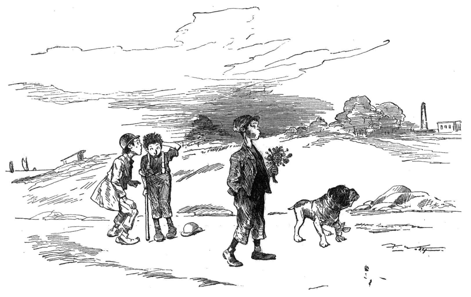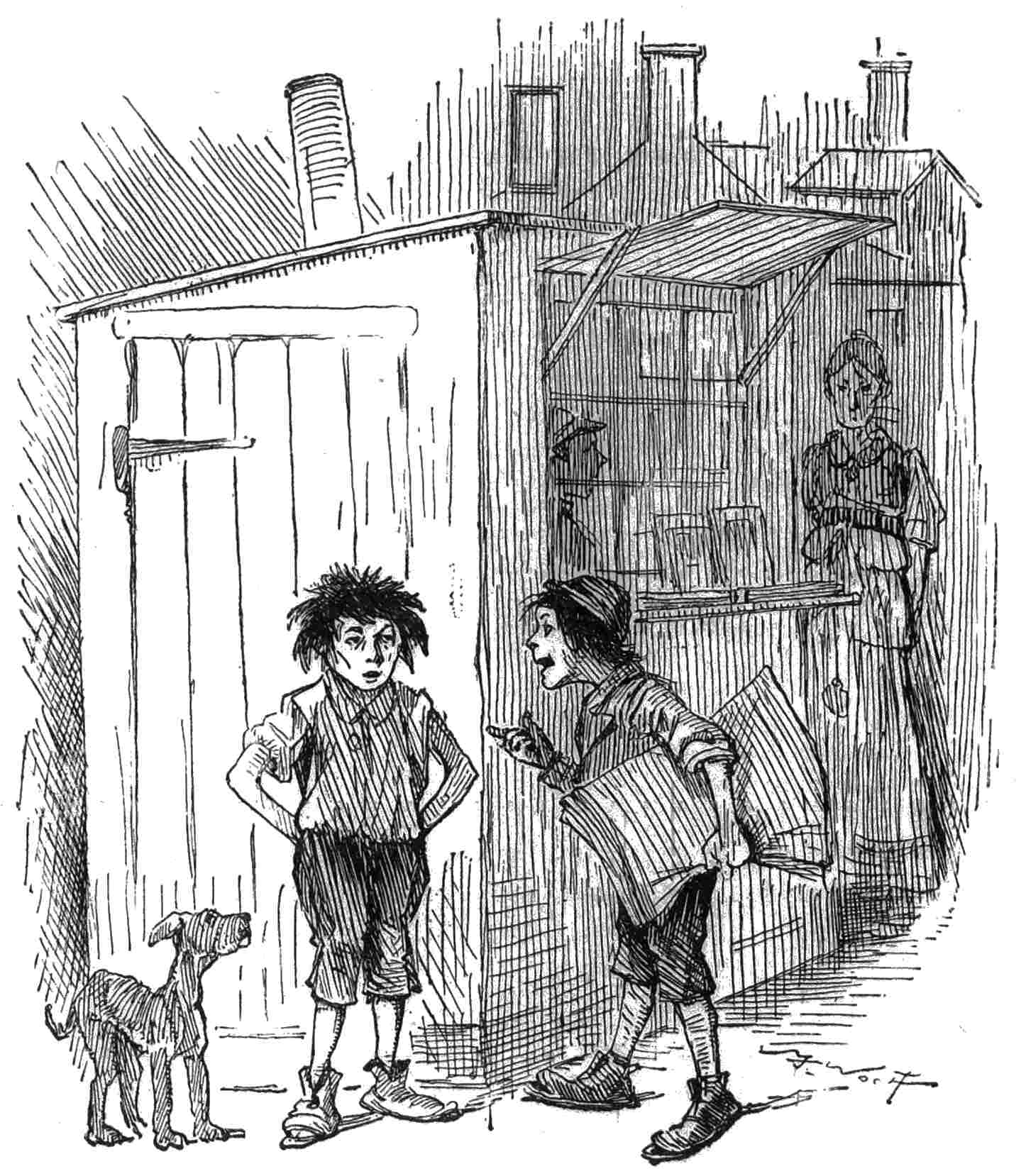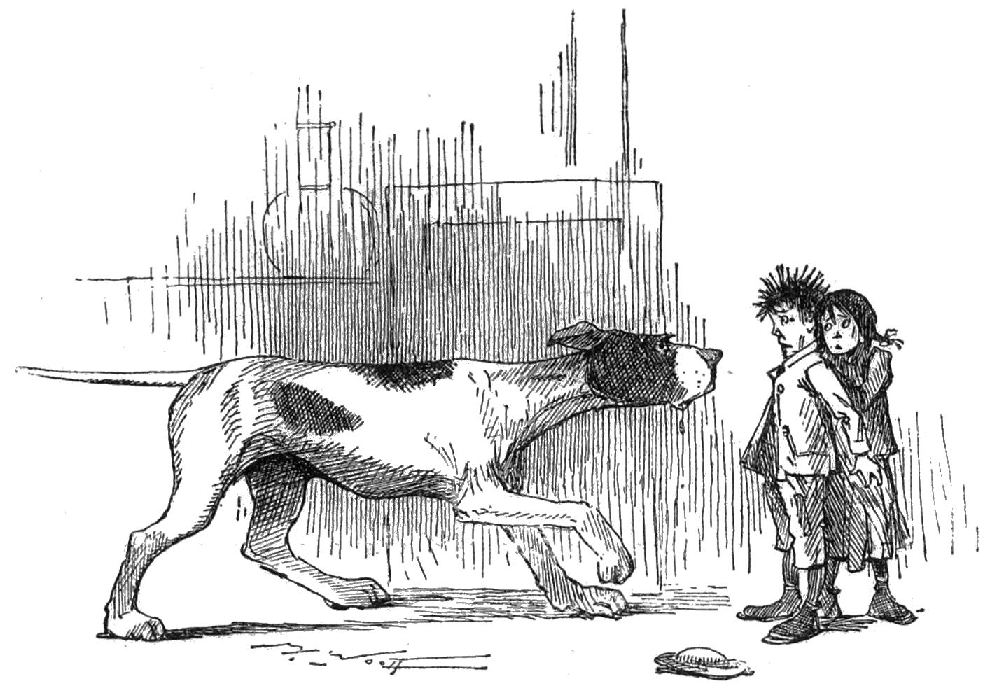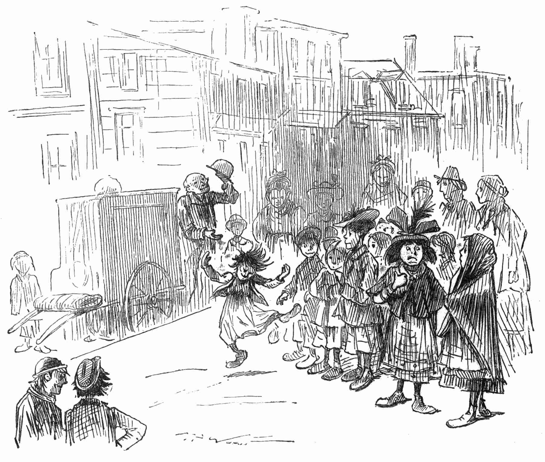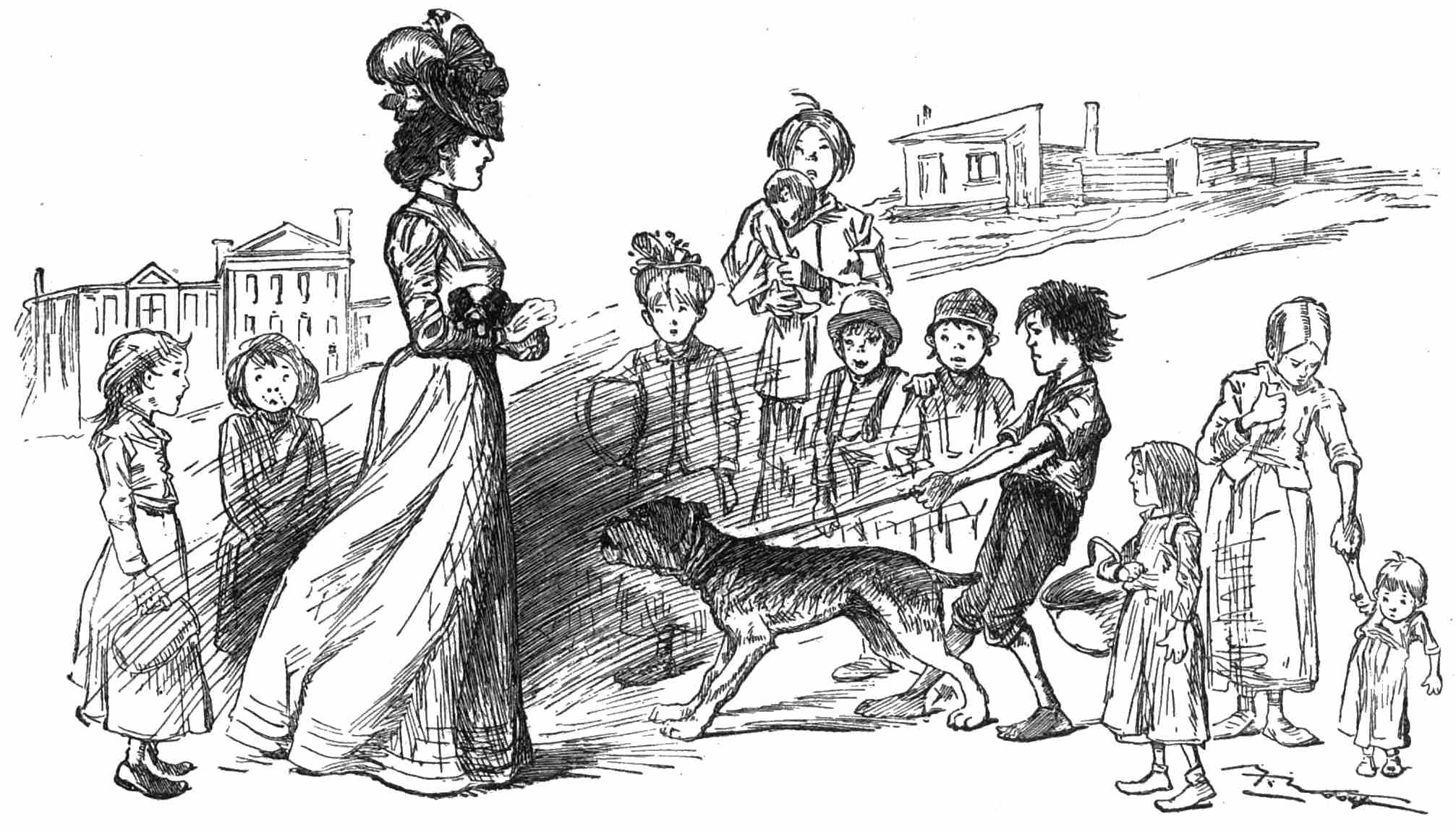 “Fellers! De gang has lost its pup! He scrapped wid a bull tarrier, an’ got it in de neck. He wuz a torrowbred, a chim dandy; a t’ree-times winner way up to de limit. He had a head on to him wot wuz almost hooman. I ain’t a-talkin’ troo me hat; I ain’t a-givin’ guff; I’m a-givin’ it to yer straight—he wuz a corker. Der Wanderbilts or Asters didn’t have de plunks ter buy dat pup—dat’s straight. He wuz way up in G—are yous wid me? His deat’ has broke me up; don’t jolly me—not on yer life. Yous wot has lungs chip in wid a song, sunthin’ sollum,—‘Ole Dog Tray,’ or ‘Sweet Maree,’—an’ den we’ll plant him. Fellers, I’se lost me grip; me name is Dennis—I’m all broke up. I’ll go chase myself an’ have a game o’ craps. S’ long!”