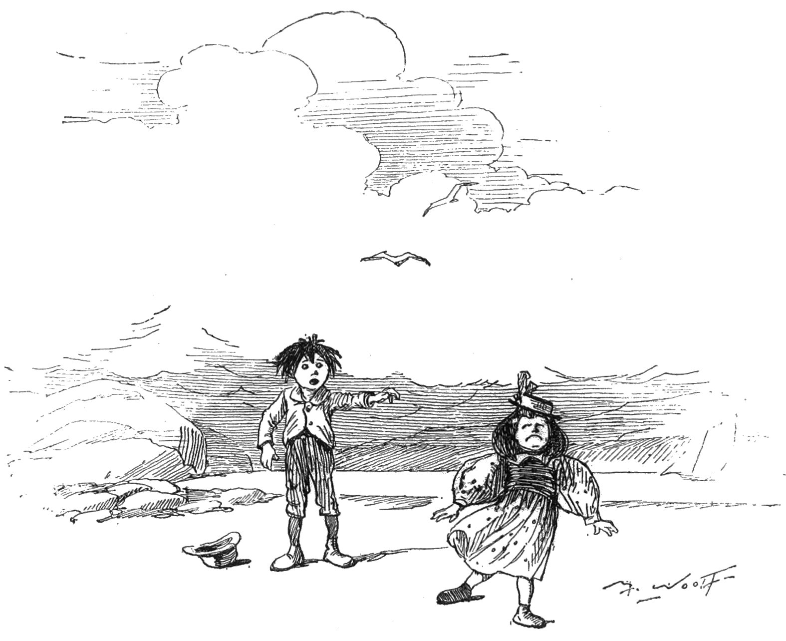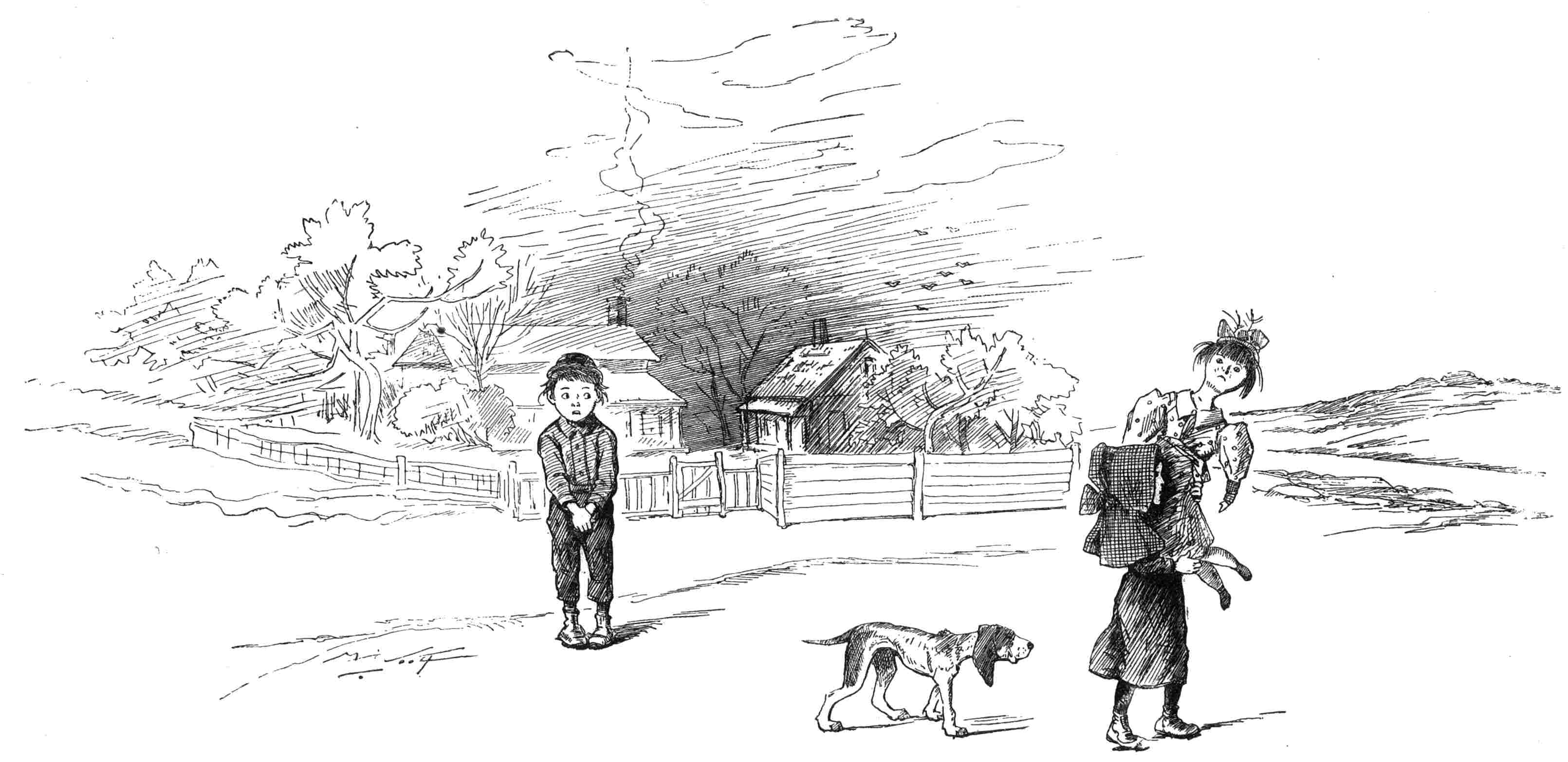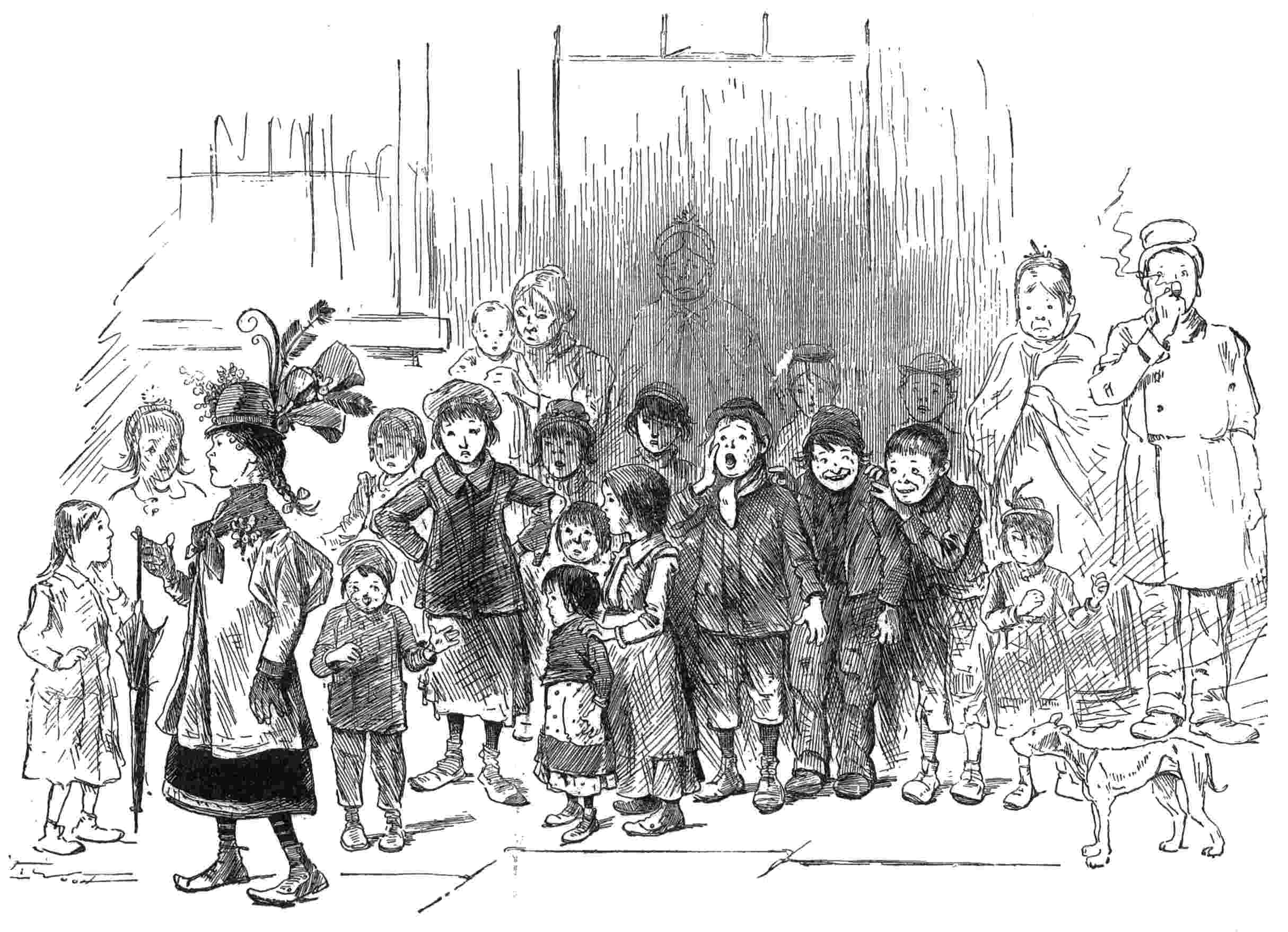 Em’ly: “Yer see I wuz carried away on a yaller cloud into a big open blue place where there wuz nothin’ but dolls—blondes, bluenettes, niggers, an’ Chinese; and Santa Claus took me by the hand an’ led me up to one o’ the most beautifullest dolls I ever seen, all gold lace an’ spangles, an’ it could talk an’ sing, too. (In rapture): Oh, it wuz too loverly for anythink! An’ Santa Claus wuz just puttin’ it into my hands when I woked up!”