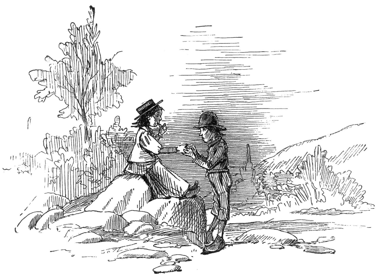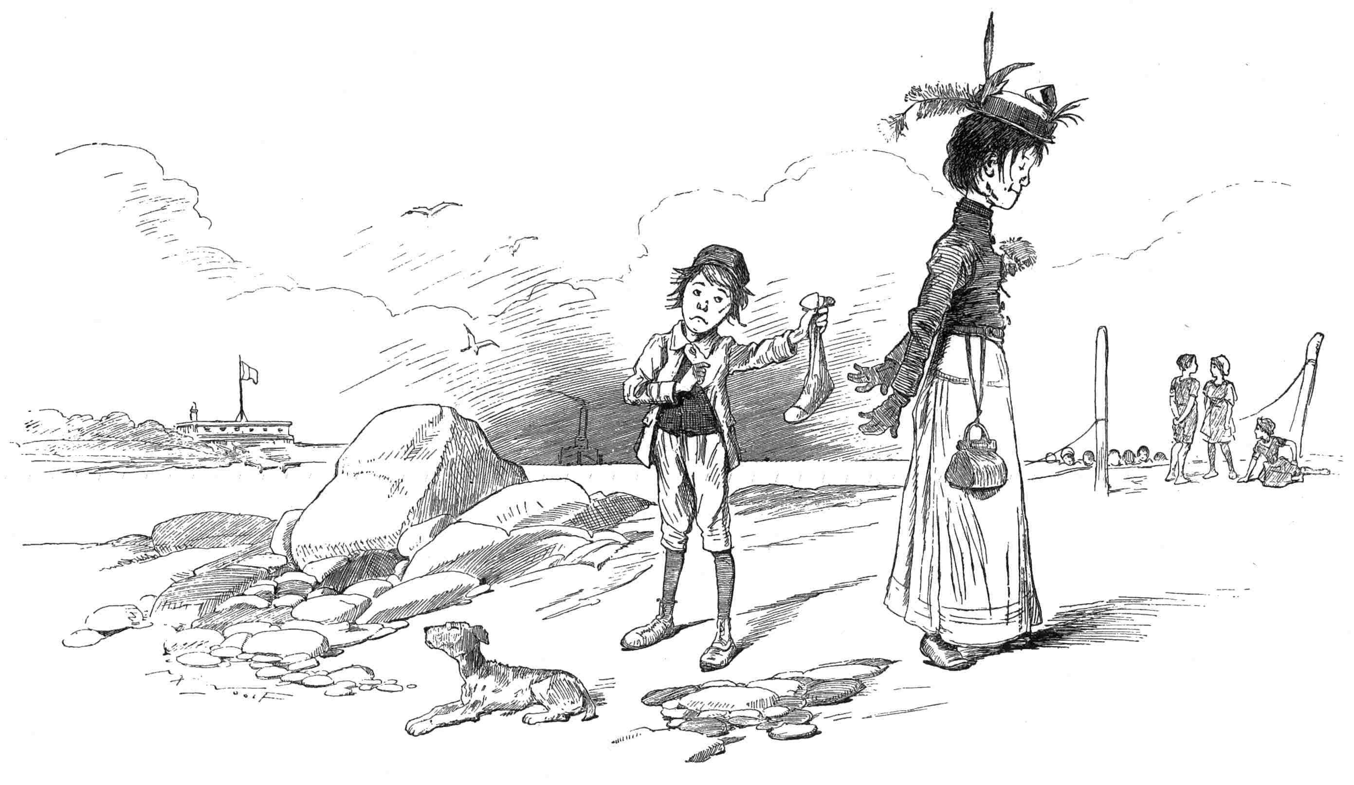 Mentor (behind rock): “Hand her de bokay, Jimmy, an’ den t’row yerself at her feet an’ tell her yer life is mizzerable, an’ dat yer’ll chuck yerself in de ocean if she don’t have yer; an’ don’t forgit de sooicide rackit. Dat fetches de wimmin every time.”