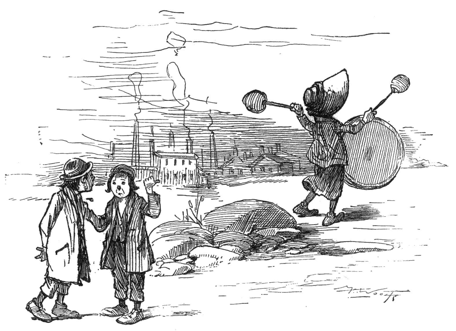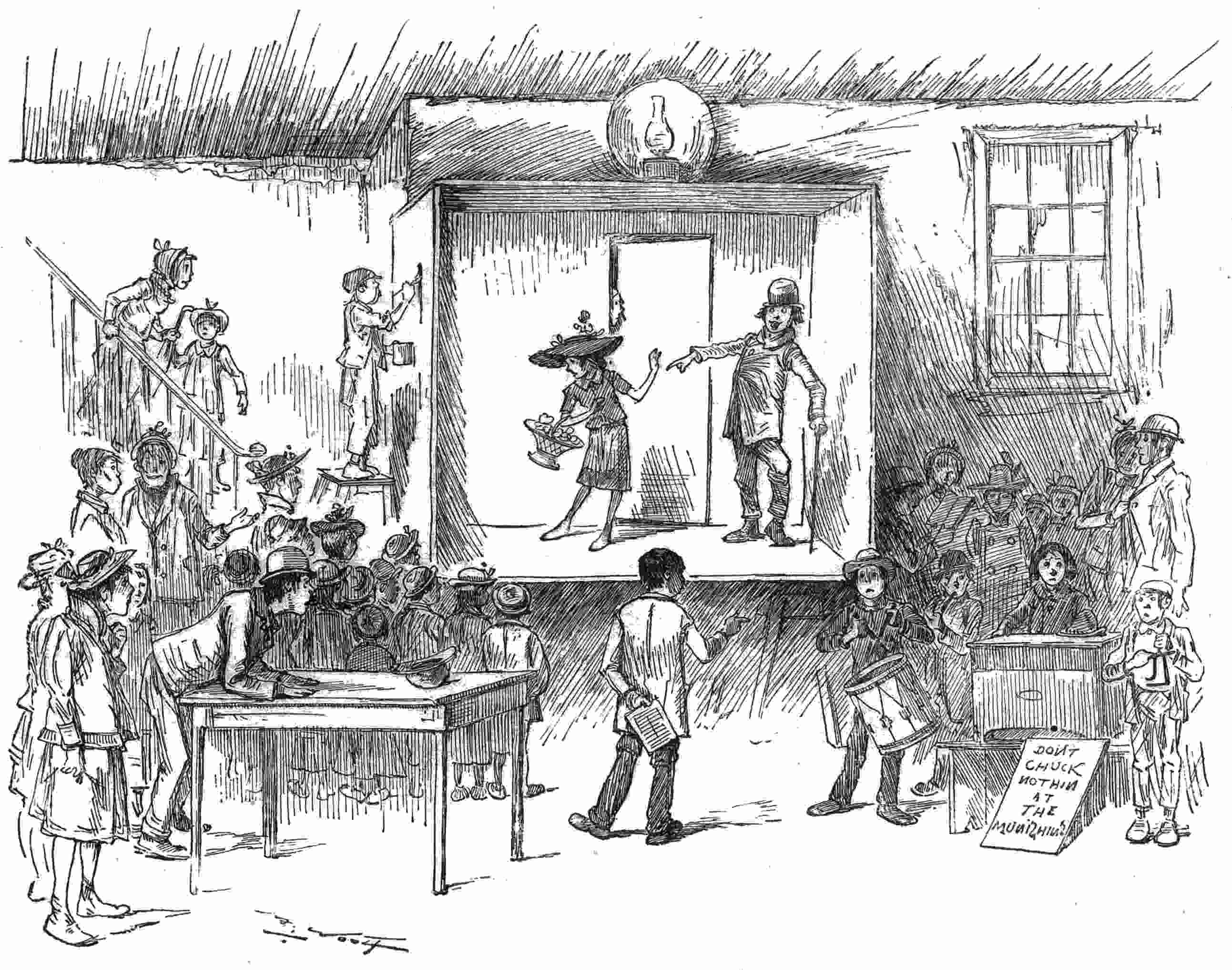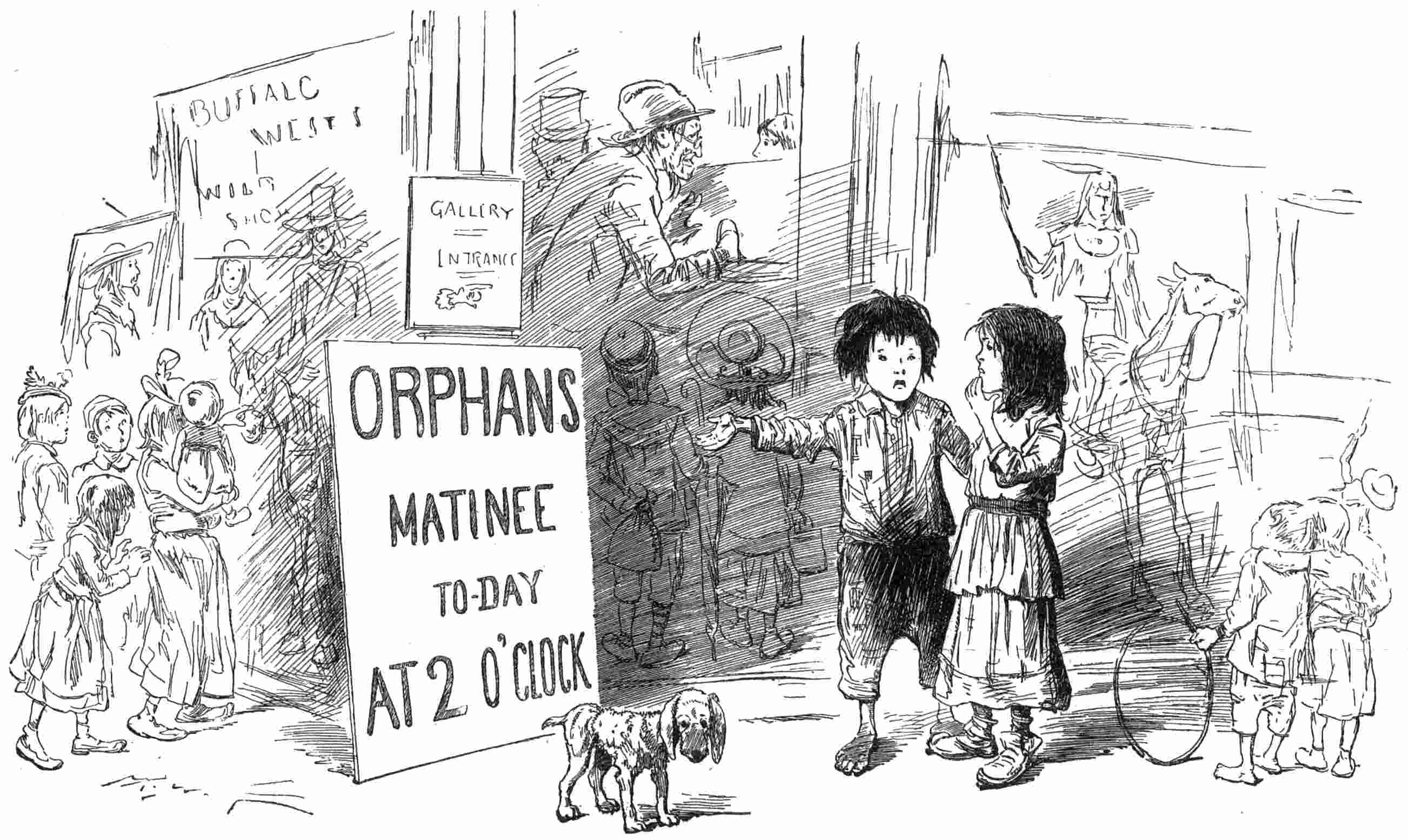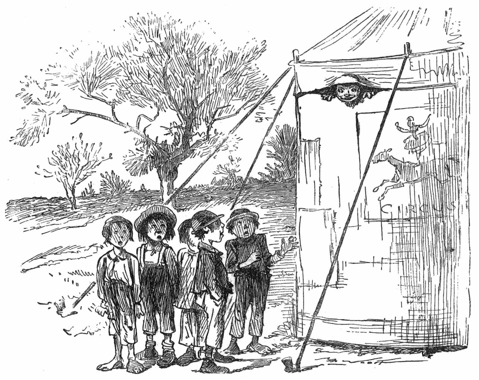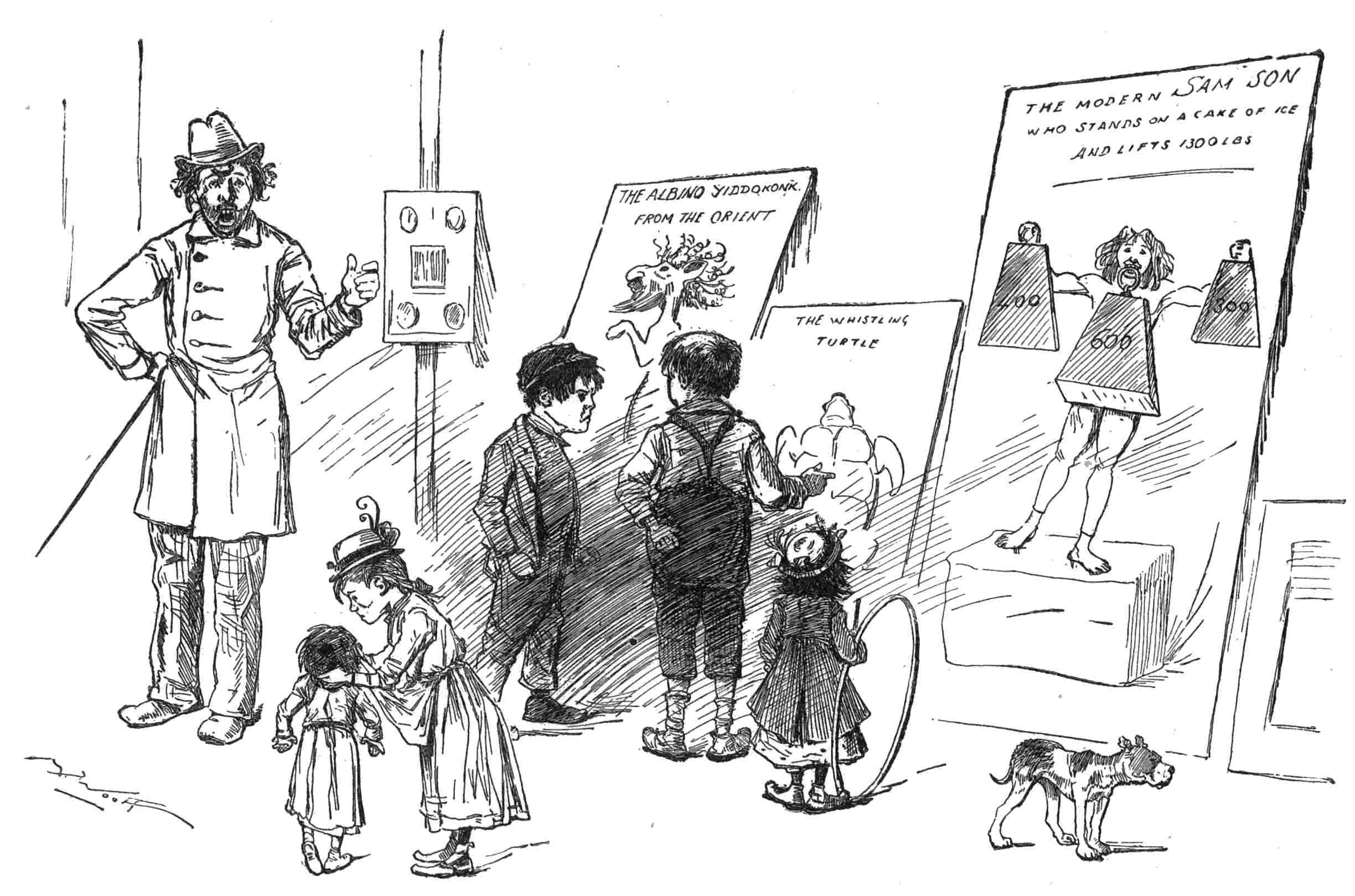 Boy (from Country Circus tent): “Hey fellers, run home an’ get de money to come in even if yer have ter steal it! It’s immense! De clown’s a-standin’ on his head an’ de baby elephant’s a-chuckin’ a pint o’ pop corn into his ears! Don’t yer wish’ t yer wuz me?”