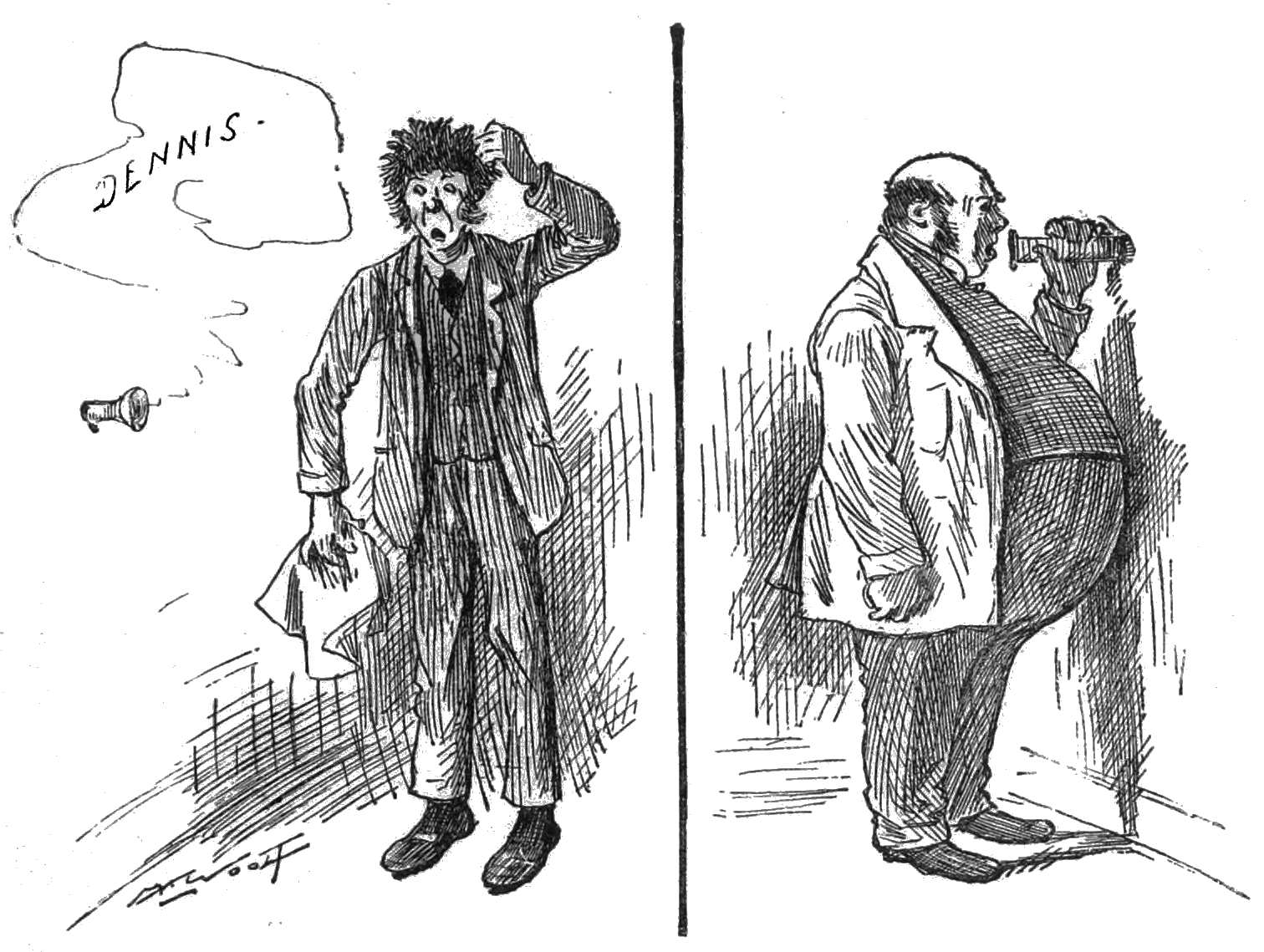 Dennis (a green hand, to whom the speaking-pipe is an unexplored mystery): “I’d give me month’s wages to foind out how the divil the boss iver managed to shqueeze himself into that bit iv a poipe!”