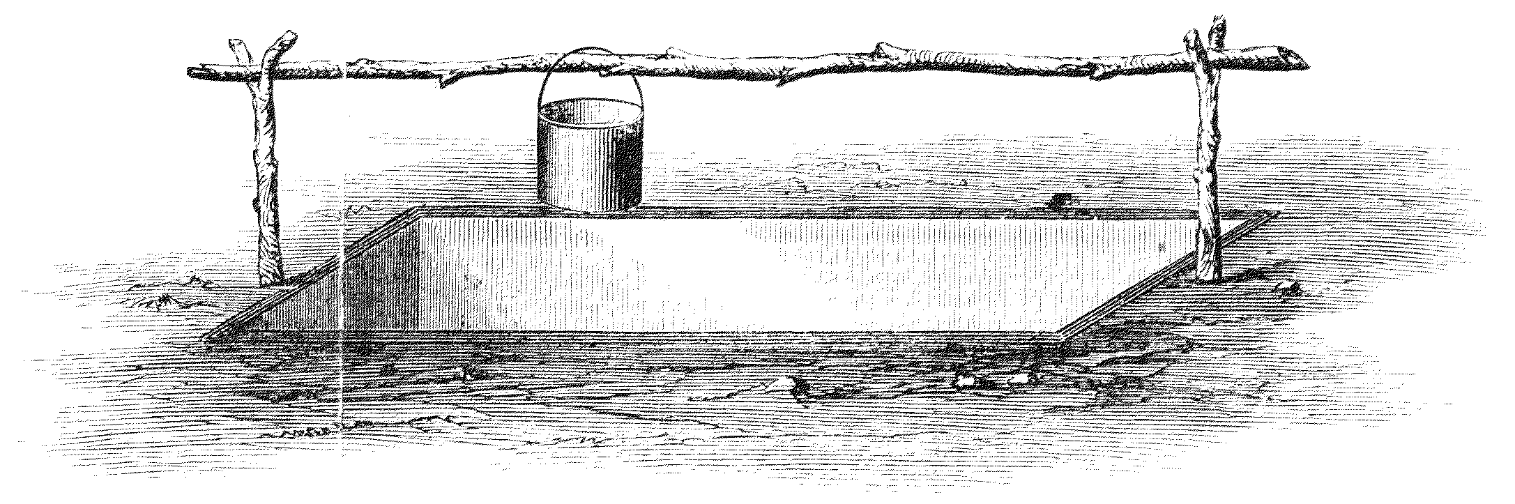 The utensils and means furnished by government to the soldier for preparing his food are of the most primitive character. The former consist of camp kettles, made of iron, with a handle, and varying in size from four to seven gallons, (they should be made so as to have one slide into the other, in nests of four,) and mess pans, also of iron, about 12 inches in diameter, and sloping to the bottom. The latter consist of a certain amount of wood per diem, which is to be consumed as taste or ingenuity may dictate. The usual and most simple mode is to dig a trench 18 inches wide, 12 inches deep, and from four to six feet long. At each end plant a forked stick of equal height, with a stout sapling, from which to suspend the kettles, extending from one to the other.
