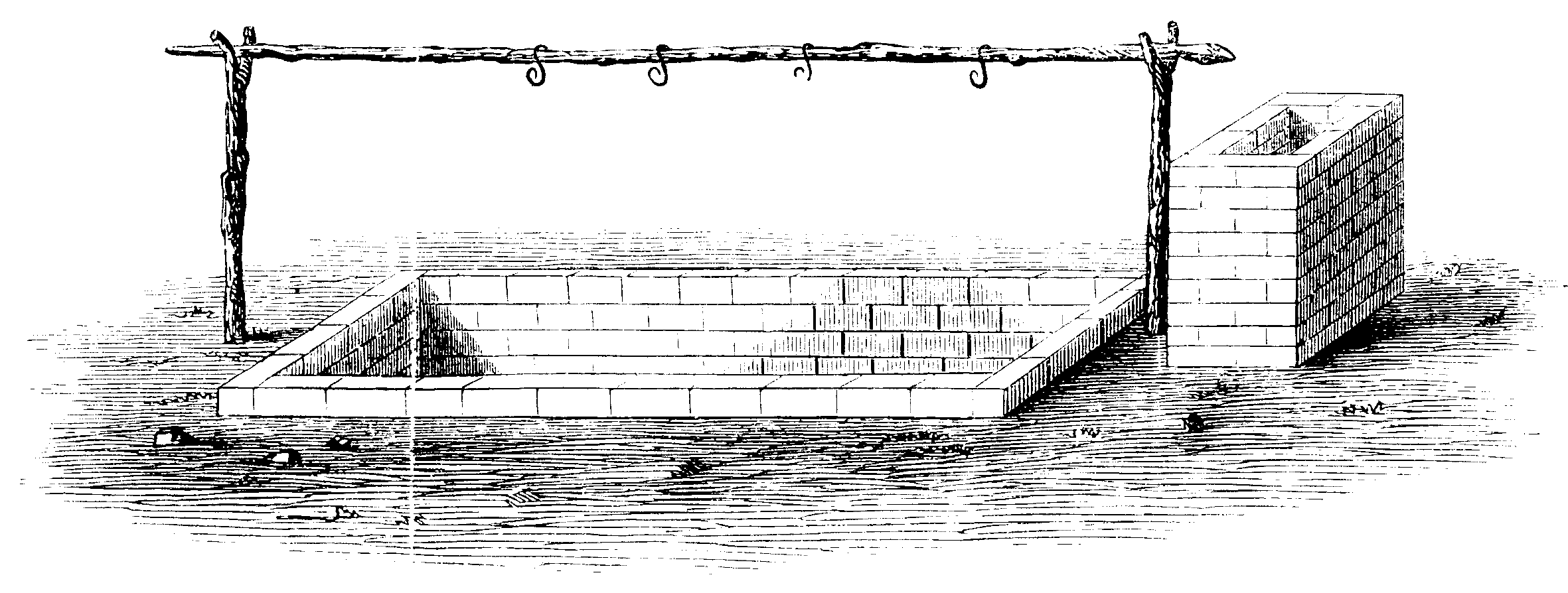 This, however, is neither the best nor most economical mode, as it consumes much fuel, wastes much of the heat, and causes great inconvenience to the cook. An improvement can be effected by casing the sides of the trench with brick, adding a little chimney at one end, and, in place of the forked sticks, using iron uprights and cross-bar, to which half a dozen hooks for hanging kettles are attached.