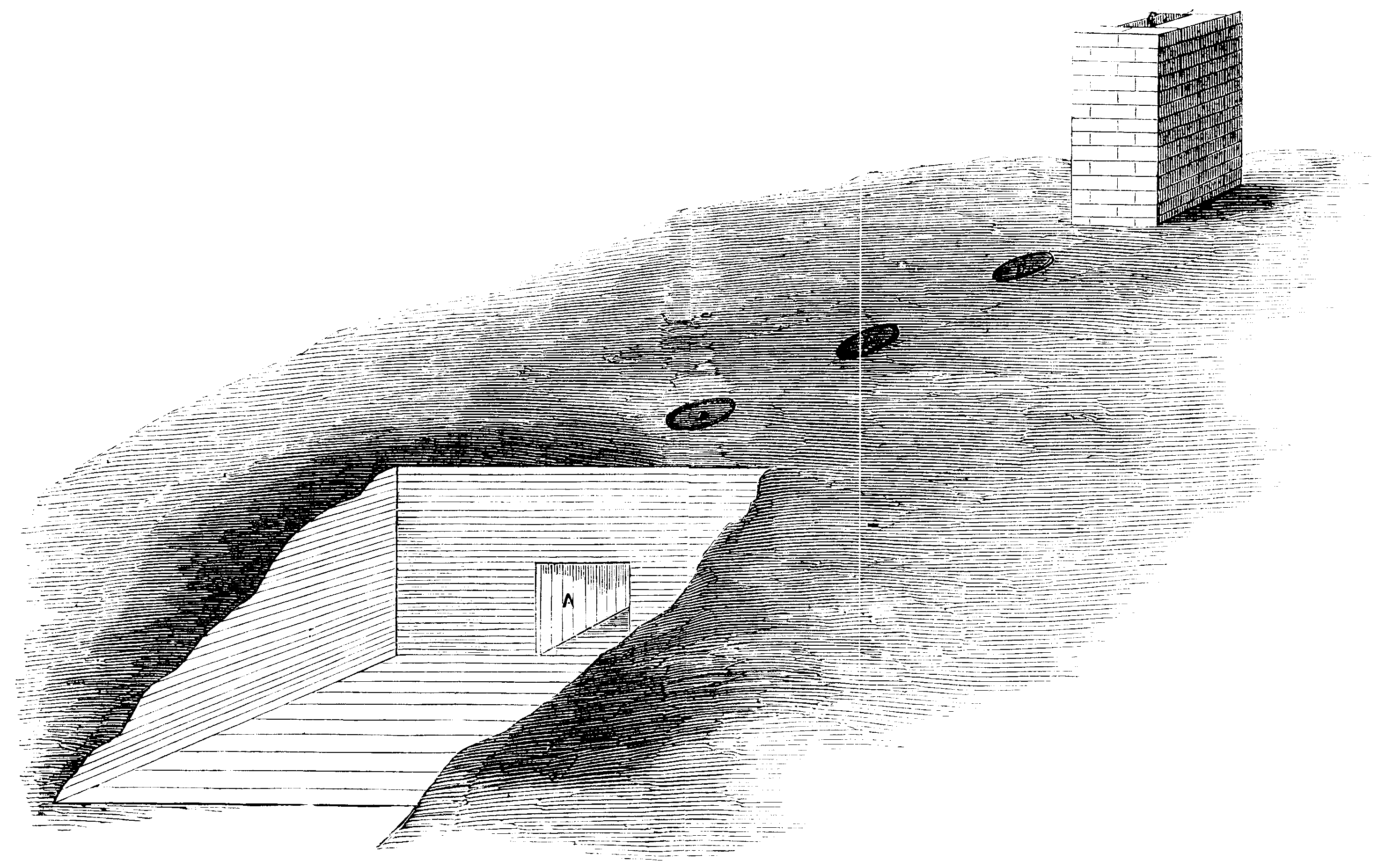 In a clayey soil, the plan adopted by the salt boilers of New York is perhaps the neatest, most economical, and most convenient that can[Pg 4] be devised. They dig a hole about three feet square and two feet in depth, generally in the slope of a hill. On one side they run a shaft laterally, about one foot square and six feet in length, and one foot from the surface of the ground. At the extreme end they sink a shaft vertically, and form a chimney; and at equi-distances they pierce three holes of sufficient diameter to prevent the kettles from slipping through. By this mode the kettles can be placed over the fire to boil—or on either side, to simmer—with less difficulty than by any other means.
