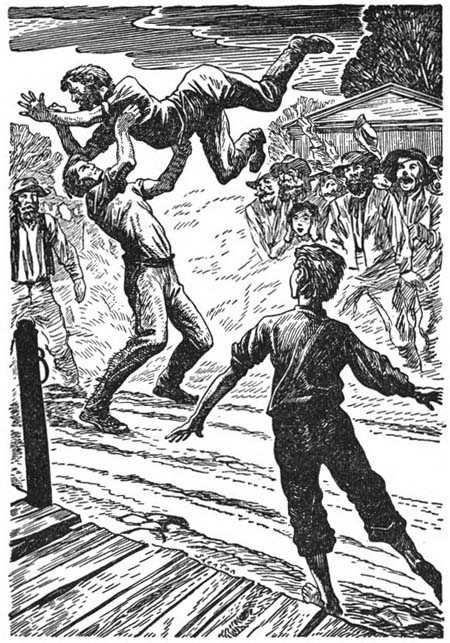 [235]The sailor lost his balance, staggered back a step or two, and toppled to the floor. Quick as a flash Abe was on top of him, gripping his wrists in those big, horny paws of his. With an anguished groan the German let go of the roll of money, and Abe, picking it up, jumped to his feet. As he did so an empty bottle whizzed past his head, and half a dozen sailormen charged toward him from all parts of the room. Instantly pandemonium was let loose. With wild yells of delight the river-men, always ready for a fight, set upon the deep-water sailors, and in ten seconds the place was filled with fiercely struggling groups.