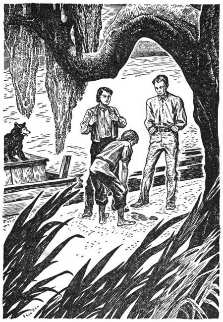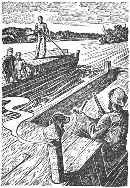 He tried to imagine what sort of life the people led, aboard those homely, slow-moving boats. Almost he envied the freckled youngster he saw fishing over the side of one weather-beaten broadhorn. If he weren’t going to New Orleans to see his Dad—well, he couldn’t help thinking what a[17] lazy, carefree, interesting voyage one could take in an Ohio River flatboat!