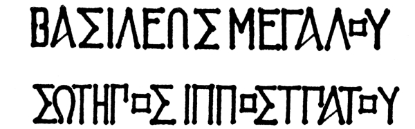 [19] It has been suggested with great probability that the title Sotēr Megas (Great Saviour) was that of the military governor (stratēgos) of Taxila under the Kushāṇas, and that these coins were the anonymous issues of successive stratēgoi. Cf. Camb. History of India, Vol. I, p. 581.
