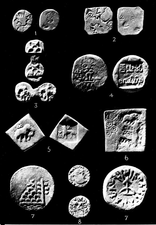 The earliest of these copper coins, some of which may be as early as the fifth century B.C., were cast. The casting of coins by pouring molten metal into a cavity formed by joining two moulds together must have been a very ancient practice in India. Sometimes the moulds of several coins were joined together for the casting process, and the joins thus left are not infrequently found still adhering to the coins [Pg 19] (Pl. I, 3).[6] These coins are for the most part anonymous. Even after striking from dies had superseded this clumsy method in the North-West, we find cast coins being issued at the close of the third century by the kingdoms of Kauśāmbī, Ayodhyā and Mathurā, some of which bear the names of local kings in the Brāhmī[7] script.
