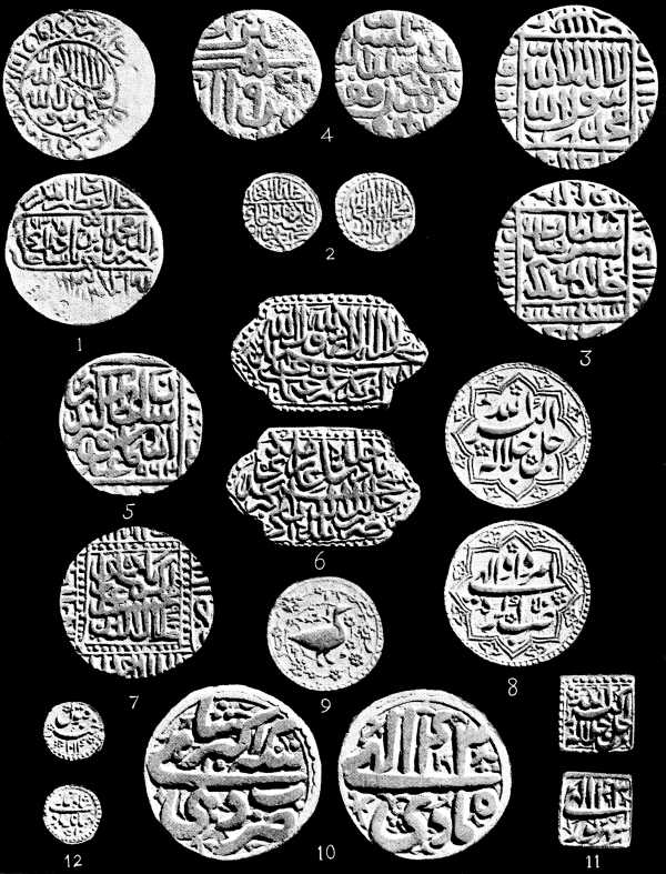 CHAP. VIII.—S. Lane Poole: Catalogue of Coins of the Muhammadan States of India in the British Museum, London, 1885; H. N. Wright: Catalogue of the Coins in the Indian Museum, Calcutta, Vol. II, Oxford, 1907. Bengal.—E. Thomas: “The Initial Coinage of Bengal,” J.A.S.B., 1867, p. 1, 1873, p. 343; A. F. R. Hoernle: “A New Find of Muhammadan Coins of Bengal” (2 papers), J.A.S.B., 1881, p. 53, 1883, p. 211. Kashmir.—C. J. Rodgers: “The Square Coins of the Muhammadan Kings of Kashmir,” J.A.S.B., 1885, p. 92. Bahmanīs.—O. Codrington: “Coins of the Bahmanī Dynasty,” Num. Chron., 1898, p. 259; J. Gibbs: “Gold and Silver Coins of the Bahmanī Dynasty,” Num. Chron., 1881. Gujarat.—G. P. Taylor: “Coins of the Gujarāt Saltanat,” J.B.B.R.A.S., 1904, p. 278. Malwa.—L. White King: “History and Coinage of Mālwā,” Num. Chron., 1903, p. 356, 1904, p. 62. Ma’bar.—E. Hultzch: “Coinage of the Sultans of Madura,” J.R.A.S., 1909, p. 667.