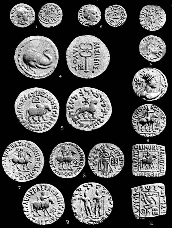 CHAPS. II-III.—A. Cunningham: “Coins of Alexander’s Successors in the East,” 1873 (= Num. Chron., 1868-1873); id.: “Coins of the Indo-Scythians,” 1892 (= Num. Chron., 1888-1892); P. Gardner: Catalogue of Indian Coins in the British Museum: Greek and Scythic Kings of Bactria and India, London, 1886; E. J. Rapson: Cambridge History of India, Vol. I, Chaps. XXII, XXIII; R. B. Whitehead: Catalogue of Coins in the Panjāb Museum, Lahore, Vol. I, Oxford, 1914.