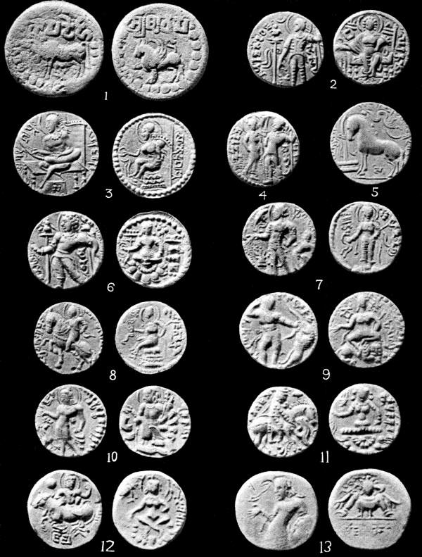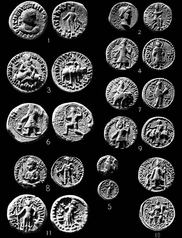 In the final stage of die-striking, devices were impressed on both sides of the coin, and the best of these “double-die” coins show not only greater symmetry of shape, either round or square, but an advance in the art of die-cutting. Some of the earliest of this type have been classed as gild tokens. The finest were struck in Gandhāra: among these one of the commonest, bearing a lion on the obverse, and an elephant on the reverse (Pl. I, 5), is of special importance, since an approximate date can be assigned to it, for it was imitated by the Greek princes, [Pg 20] Pantaleon (Pl. II, 2) and Agathokles, who reigned on the North-West frontier about the middle of the second century B.C. In the execution and design of some die-struck coins from the North-West there are undoubted traces of foreign influences: but such devices as the humped bull, the elephant and the religious symbols are purely Indian. There is, on the other hand, little foreign influence traceable in the die-struck coins, all closely connected in point of style, which issued during the first and second centuries B.C. from Pañchāla, Ayodhyā, Kauśāmbī and Mathurā. A number of these bear Brāhmī inscriptions, and the names of ten kings, which some would identify with the old Śuṅga dynasty, have been recovered from the copper and brass coins of Pañchāla, found in abundance at Rāmnagar in Rohilkhand, the site of the ancient city Ahichhatra. Similarly twelve names of kings appear on the Mathurā coins, but we have little knowledge of these kingdoms beyond what the coins supply. Certain devices are peculiar to each series: thus most of the Ayodhyā coins have a humped bull on the obverse, the coins of Kauśāmbī a tree within a railing.