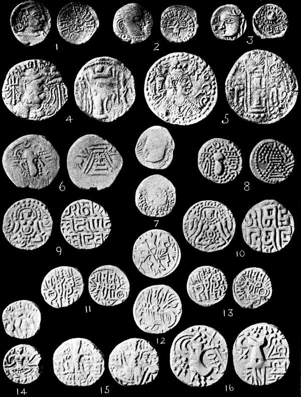 CHAP. I.—A. Cunningham: Coins of Ancient India, 1891; E. J. Rapson: Catalogue of the Coins of the Andhra Dynasty, the Western Kṣatrapas, etc., in the British Museum, London, 1908; W. Theobald: “Notes on Some of the Symbols found on the Punch-marked Coins of Hindustan,” J.A.S.B., 1890, p. 181; E. H. Walsh: “An Examination of a Find of Punch-marked Coins in Patna City,” Journal of the Bihār and Orissa Research Society, 1919, p. 16, p. 463.