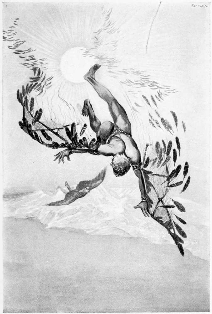 When the father and son started for Sicily, over the [Pg 33]Ægean sea, like a pair of huge birds, Dædalus flew conservatively and cautiously, being careful not to rise too near the sun, where it was supposed by the ancients to be very hot; but Icarus, with the spirit of youth and the enjoyment of the exhilaration consequent upon the novelty of his method of locomotion, gave a deaf ear to the protests of his father, and, in emulation of Apollo, soared so high that the sun melted the wax in his wings. His feathers flew off, and down he dropped into the waves below. He was drowned, and that part of the Ægean sea into which he fell was afterward called the Icarian sea, in commemoration of this unfortunate accident, which Darwin has so well described in verse: