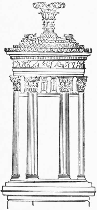 To Scopas, in co-operation with Praxiteles, is also attributed the graceful and beautiful Choragic monument of Lysicrates, at one time called “the lantern of Demosthenes,” from the mistaken supposition that the great orator used it as a study—a very strange use when it is remembered that the little structure possessed neither doors nor windows. In its day this monument was the pride of the street of Tripods, and it still stands one of the best preserved evidences of the taste and skill of its designers.