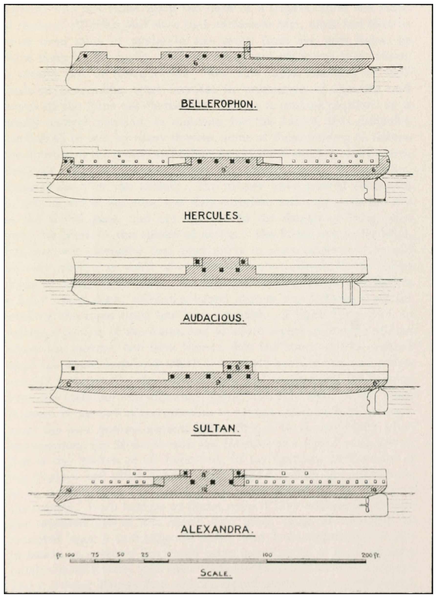 106 The Sultan was built as a ship-rigged ship. In 1894–96 she was “reconstructed,” two military masts being substituted for her original rig. She was also re-engined and re-boilered by Messrs. Thompson, of Clydebank. Beyond going out for the naval manœuvres one year she did not, however, perform any service in her altered condition, and is now used as a hulk.