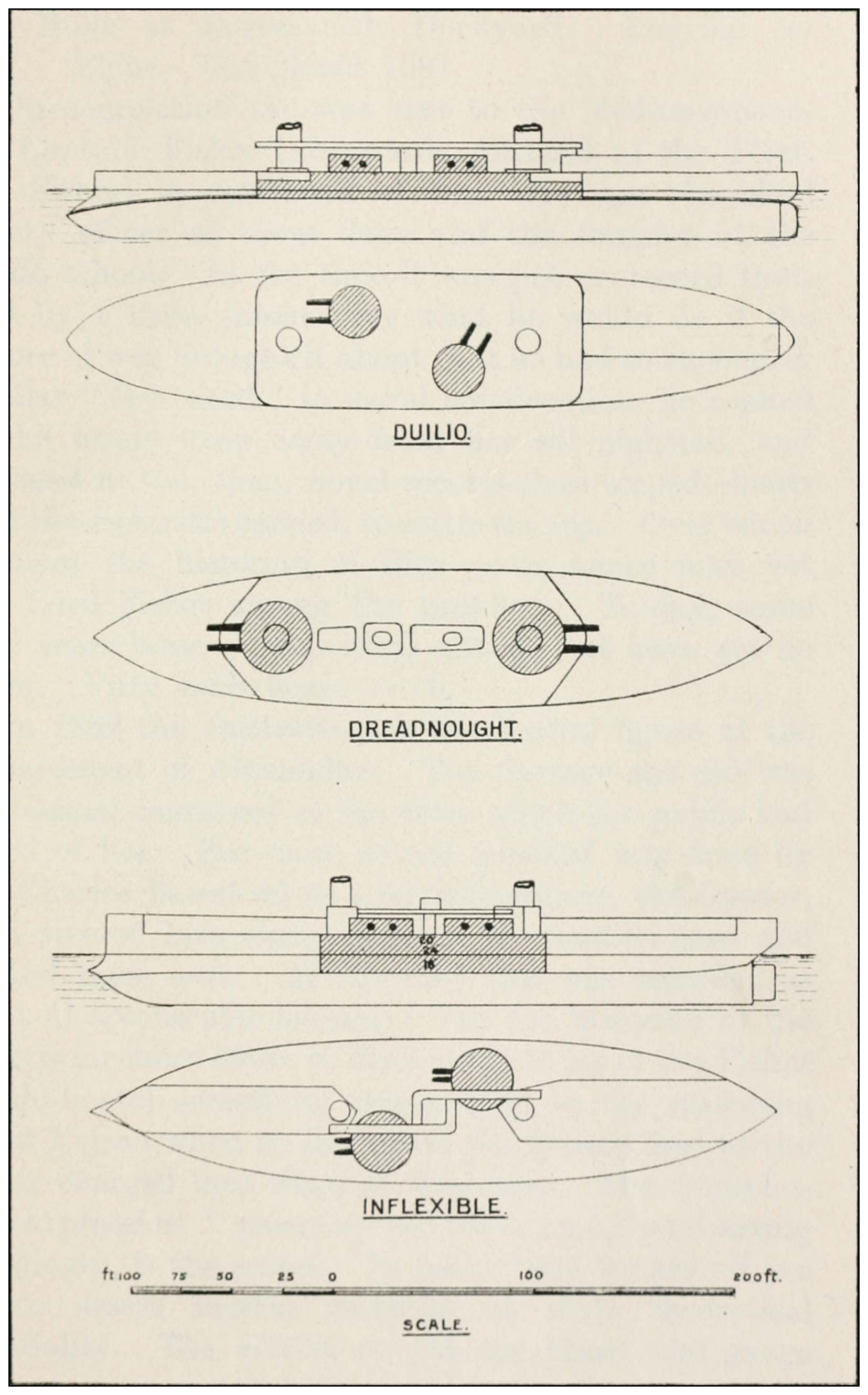 Compared with these Italian designs, the most powerful British ironclad of those days, the Dreadnought, with a belt of only 14-inch to 11-inch armour, and bearing but two of her four 38-ton guns end-on, cut a sorry figure.
