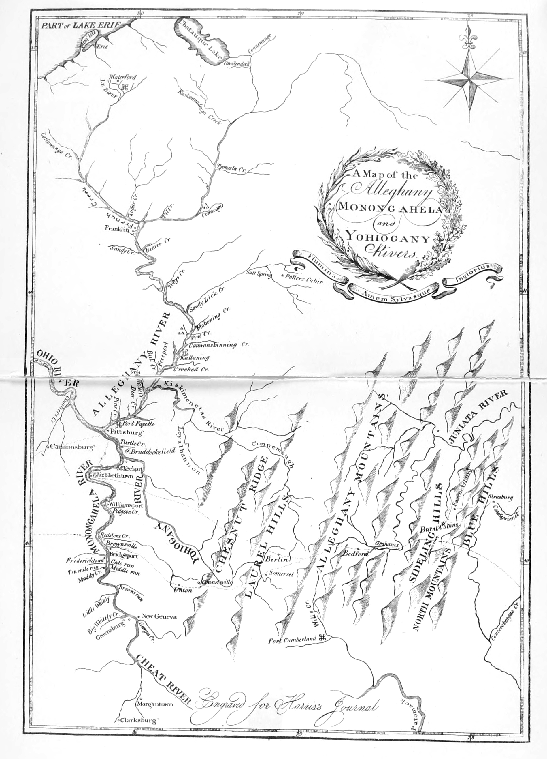 [7] Harris’s allusions to the various roads are confusing and misleading. The road (Pennsylvania State) which he left to the north, passing through Ligonier and Greensburg, followed in the main the route cut (1758) for Forbes’s army. Braddock’s Road lay much to the south of this, going out from Fort Cumberland, Maryland, on the Potomac. The question of the availability of these two roads was a point at issue during Forbes’s campaign. See Hulbert, Historic Highways of America (Cleveland, 1903), vols. iv, v. Harris took neither Forbes’s Road, nor Braddock’s (later the line of the Cumberland National Road), but what was locally known as the “Old Glade Road,” a branch of Forbes’s Road, leaving the latter four miles beyond Bedford, and crossing to the Youghiogheny through Somerset and Mount Pleasant.—Ed.
