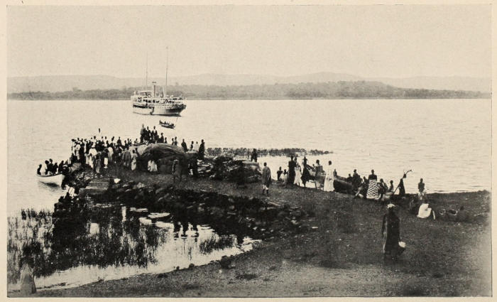 On the morning of the eighth day we were all eagerly examining the fringe of land lying straight ahead. The opera glasses spied out a few dark figures moving about close to the landing stage. In imagination and Pears’ Soap advertisements I had often seen the picture, the blue, transparent water, a stretch of sandy shore—the background of banana trees and palms, a few grass huts, and a dark-skinned figure standing out in bold relief with the broad smile displaying a row of white teeth. “Otyano Munange” (How do you do, my friend?) and a prolonged exchange of grunts greeted us as we stepped from the dhow on to the shores of Port Munyonyo.