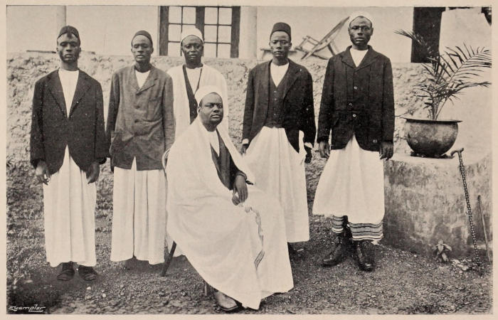As we stepped from the ship’s deck on to the landing-stage the sun felt distinctly African. The dazzling white and somewhat congested streets seemed to singe our very boot leather. It was a relief to have pointed out a strip of bright green mainland which lay at the extreme end of a sheltered bay, as the place where hospitality would be offered me and two others of our party of seven, while preparations were being made for our journey up country. A short row brought us to this mission station of the Church Missionary Society—Freretown—the situation of which is very pleasing; in front stretches the transparent blue bay, beyond to the right the white minarets and red tiled roofs of Mombasa, and all around dense foliage—mango and banana trees, creepers and shrubs and flowers in tangled confusion. A warm English welcome awaited us from our missionary friends there who were domiciled in a solid two-storied brick house.