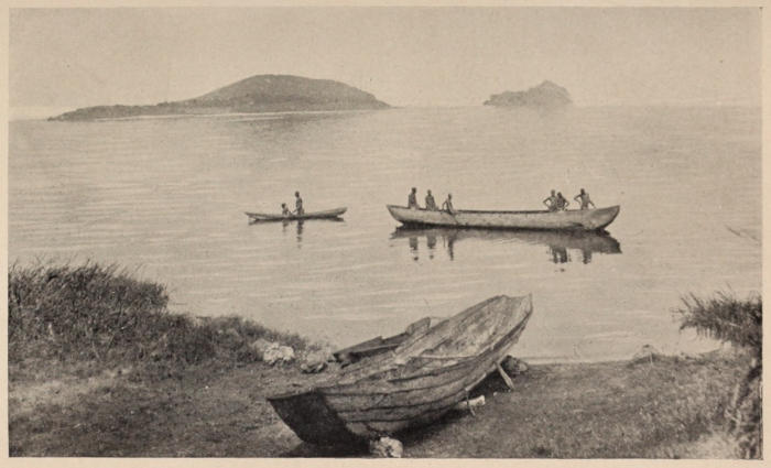 On the third day of our trip we were becalmed, and it was decided to land on an island for the night so that we might get a complete change of toilet and rest. There was no canoe at hand to take us ashore, so a raft was constructed of poles and two large Masai hide shields which had been given me up country. We crossed over, two by two, carefully balanced in the centre of the raft, with shoes and stockings in our hands. The men managed to get a few things across, but the raft would not bear the weight of the tents. A ground sheet was once more utilized by tying it to branches of trees to form a covering over our camp and beds at night. Looking through the mosquito net I saw the stars peeping down, and the fireflies and glow worms lighting up the air and shrubs, and heard the croaking of the frogs and the night bird cooing in the trees. It seemed like a page out of childhood’s fairy book.