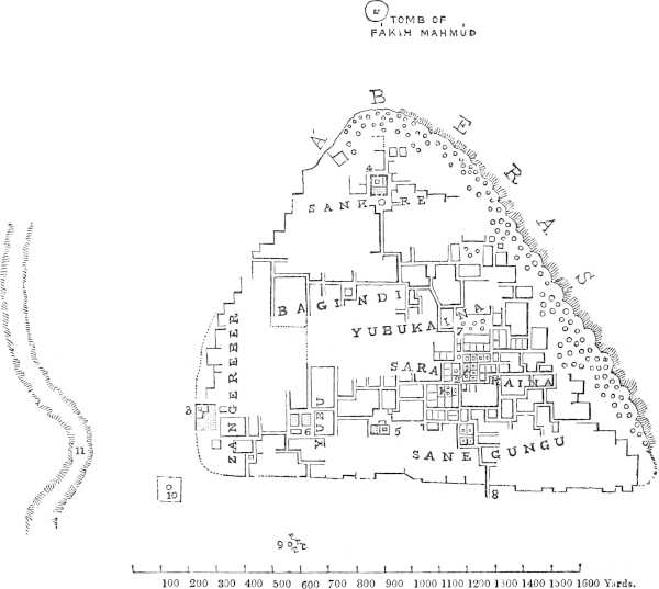 | Leave the Town. — The Camp. — Political Schemes. — Attempt at Proselytism. — Return to Town. — Movements of the Fúlbe. — Annoying Circumstances. — Excursion to Kábara. — Note on the Royal Residence in Hamda-Alláhi. — A few Palm-trees. — The Great Mosque. — Ground Plan of the Town. — Circumference. — Wall. — The Different Quarters of the Town. — Inhabitants. — Another Stay in the Camp. — Sand-eating. — Private Life in Camp. — Tediousness of Position. | |