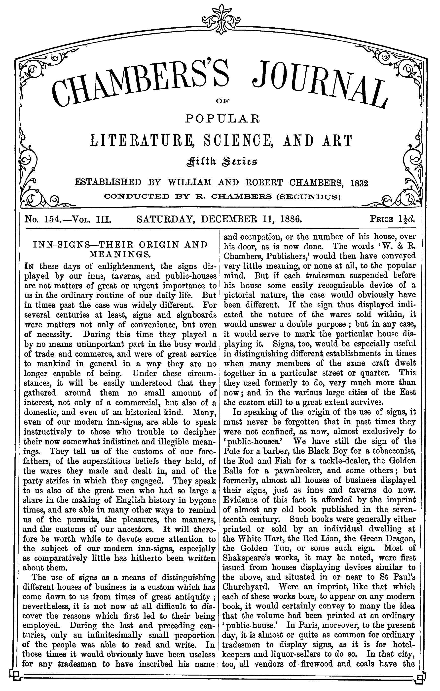 The use of signs as a means of distinguishing different houses of business is a custom which has come down to us from times of great antiquity; nevertheless, it is not now at all difficult to discover the reasons which first led to their being employed. During the last and preceding centuries, only an infinitesimally small proportion of the people was able to read and write. In those times it would obviously have been useless for any tradesman to have inscribed his name and occupation, or the number of his house, over his door, as is now done. The words ‘W. & R. Chambers, Publishers,’ would then have conveyed very little meaning, or none at all, to the popular mind. But if each tradesman suspended before his house some easily recognisable device of a pictorial nature, the case would obviously have been different. If the sign thus displayed indicated the nature of the wares sold within, it would answer a double purpose; but in any case, it would serve to mark the particular house displaying it. Signs, too, would be especially useful in distinguishing different establishments in times when many members of the same craft dwelt together in a particular street or quarter. This they used formerly to do, very much more than now; and in the various large cities of the East the custom still to a great extent survives.