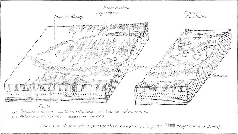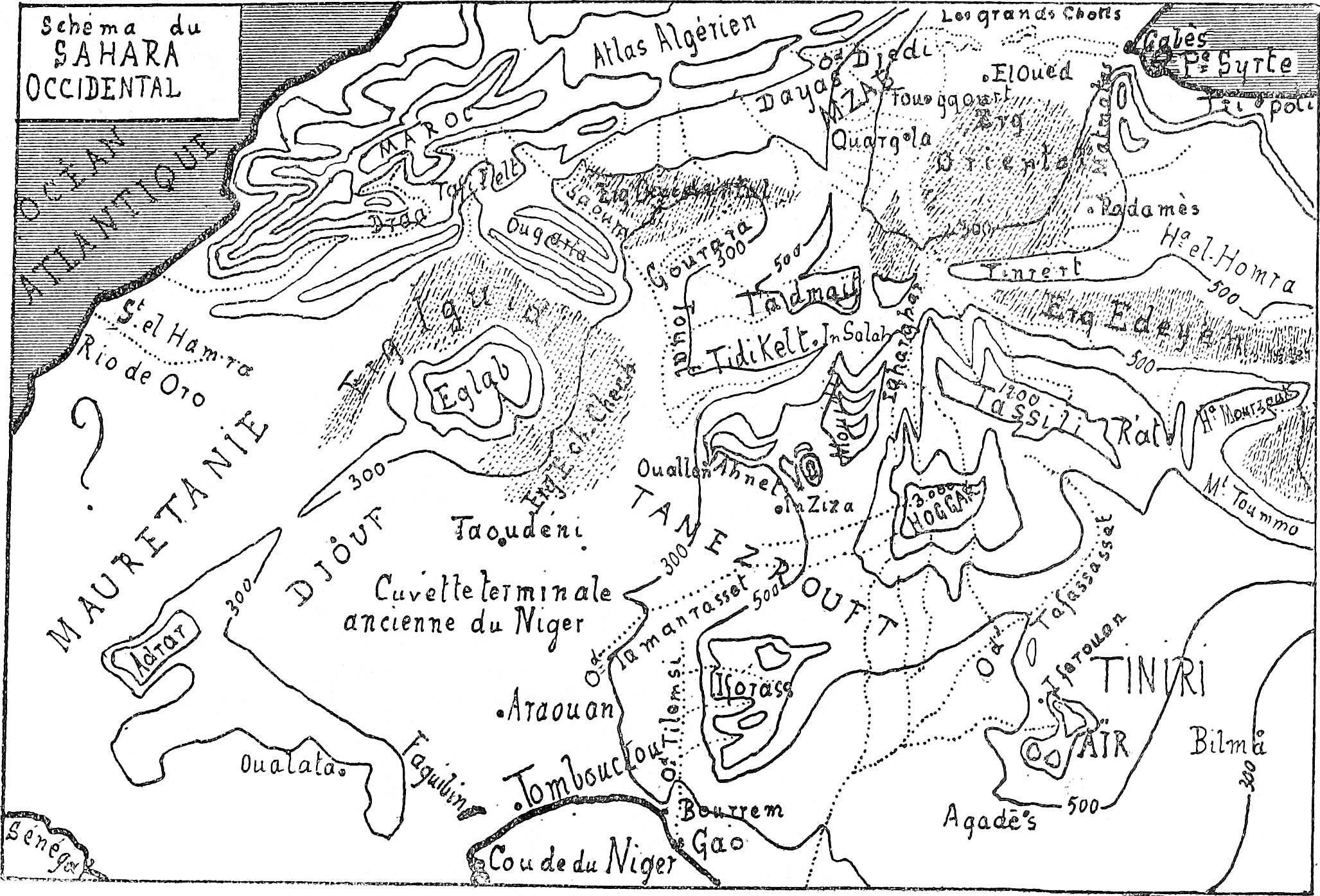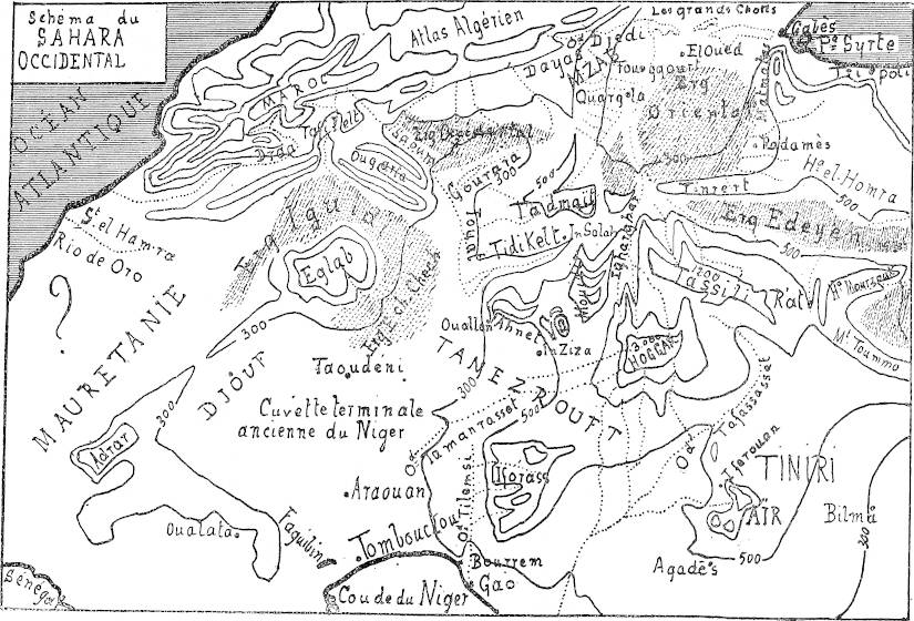 Tout se passe comme si, dans cette portion étendue de la croûte planétaire, il y avait eu quelque chose comme une tendance à « la torsion du géoïde ». Le relief du Sahara tout entier, considéré d’une façon très générale, doit à cette circonstance une simplicité grandiose de dessin.