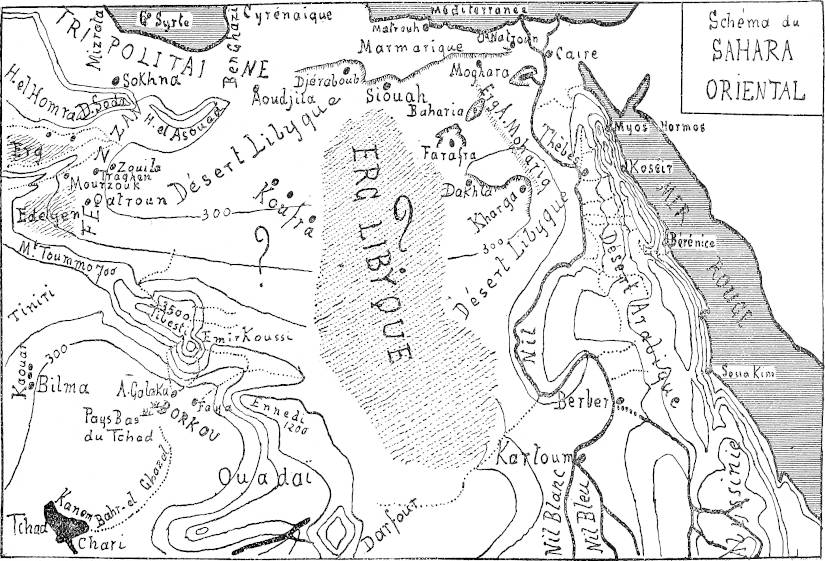 La traînée des volcans à travers tout le Sahara Central s’aligne grossièrement, mais nettement, dans une direction est-ouest, entre le Tibesti et In Zize, en passant par l’Aïr et le Hoggar. C’est la direction de l’Atlas ; c’est celle de la côte sud méditerranéenne[17] sur toute son étendue ; c’est celle que suit un grand système de dépressions articulant presque tout le Sahara Septentrional, puisqu’il se laisse suivre, à peu près sans interruption, depuis le Caire jusqu’à In Salah, dans l’extrême Sud algérien. Ce chapelet de dépressions est festonné presque partout de falaises à regard sud ; celles qui limitent au sud la Marmarique et la Cyrénaïque ; la Hamada el Homra en Tripolitaine ; directement continuée en territoire algérien par le Tinr’ert, et les falaises terminales du Tadmaït. Les oasis célèbres de Siouah (Jupiter Ammon), de Djeraboub, d’Aoudjila, et beaucoup plus loin après une interruption, celles du Tidikelt s’alignent au pied de ces falaises, dans la même direction générale est-ouest ; celle de la latitude.