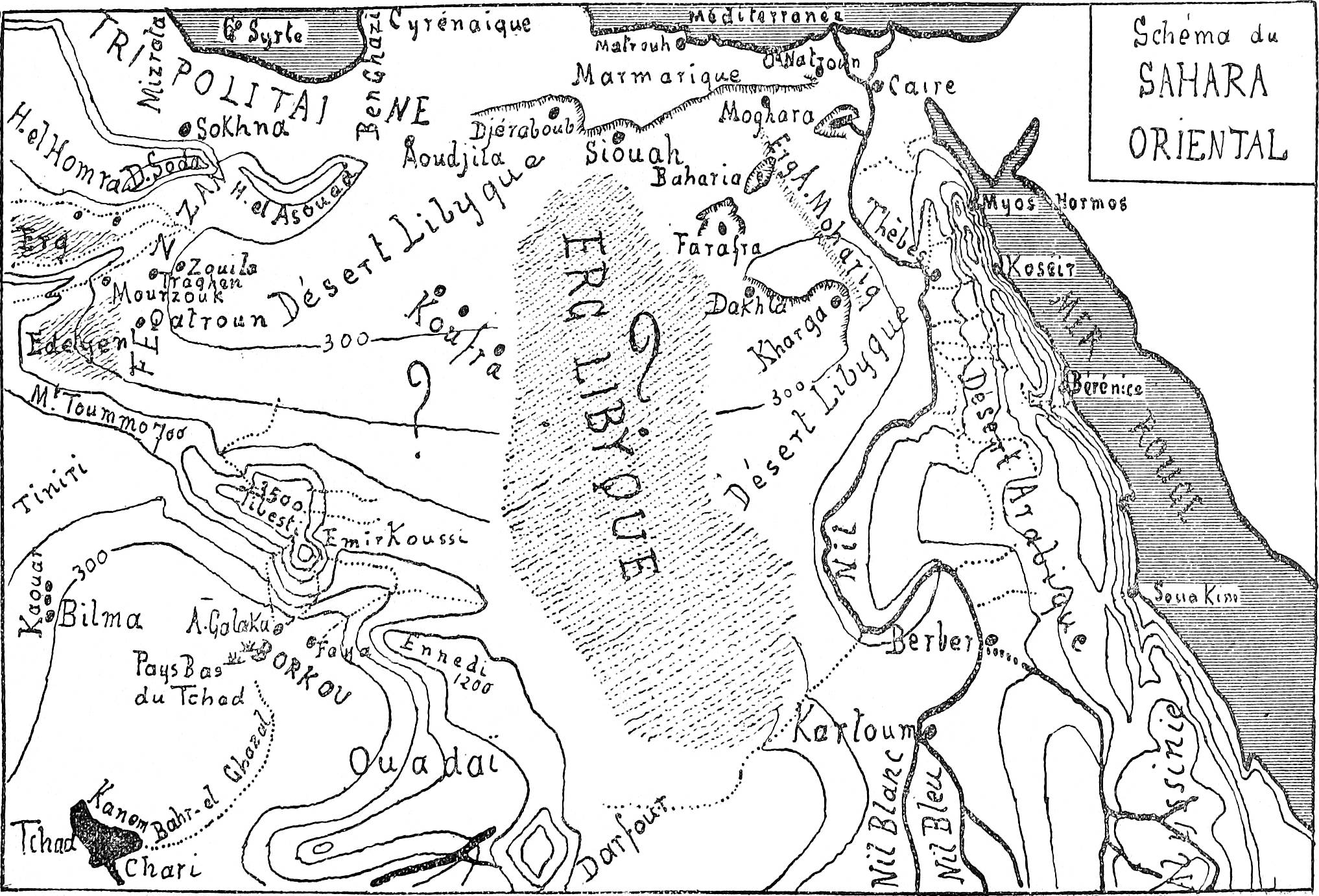 Le Sahara Central est la partie la moins étudiée. L’Italie, qui en a le contrôle, n’est entrée en scène que très tardivement, à la veille de la grande guerre ; elle n’a pas eu le temps, et encore bien moins, à cause de la guerre, le loisir d’organiser l’enquête scientifique. Elle l’a amorcée pourtant. D’autre part,[11] c’est justement sur ce Sahara Central que nous avons les livres de Barth, de Nachtigall, de Duveyrier. Les deux missions Tilho, parties du Soudan français, ont définitivement élucidé la question du Tchad ; et la seconde nous a documentés sur le Tibesti. Sur la mystérieuse Koufra des renseignements, qui complètent ceux de Rohlfs, viennent de nous être apportés par plusieurs voyageurs, Lapierre, miss Rosita Forbes, Hassanein Bey.
