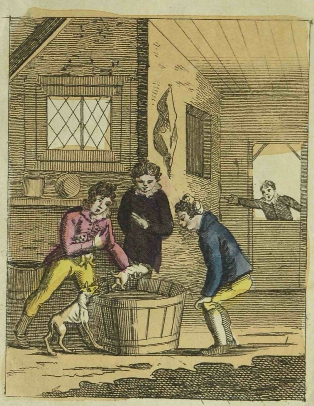 ‘They then left me, overwhelmed with confusion. I felt so much gratitude to Henry for his kindness, that I determined never to be guilty of the like offence again. I wish all children would reflect how much better it is to use us poor animals with kindness, than cruelty: had these gentlemen beaten me, I should have thought that sufficient punishment; as it was, I determined their mildness should not be misapplied, and longed for an opportunity of shewing my reformation. One soon offered: I told you my master [Pg 49]was fond of pigeons; one day, when he was in the loft, where they were kept, I passed; but, determined to keep out of temptation, I was going down stairs, when I saw a large black rat, with eyes of fire. My ambition was excited to attack so noble a foe: besides the glory of conquest, I was urged by hunger, for my mistress had that day ordered the servant to give me my dinner, which she had neglected: it was now evening, and I had not eaten since early in the morning. I did not spring upon the rat, without giving [Pg 50]him warning, as, I am sorry to say, is too often the case with our species, but gave him timely notice, by spitting and swearing; but, though he was of the largest size, and I not yet at my full growth, the coward fled. I pursued close upon him, without regarding whither he led me; he ran into a hole, and I took the watch before it, ready to seize him the moment he came out. At last my hunger got the better of my glory, and I determined, reluctantly, to give up my prey, and get something to eat; but, to my surprise, [Pg 51]I found myself in the very loft where all the pigeons were, the door locked, and no creature near. I searched round and round for a place to creep through, but, alas! no one presented itself. My master, I knew, would not visit his pigeons until the next night; how was I, hungry as I then was, to wait so long without food? Young pigeons were all round; what an opportunity for a feast! I approached one, but checked myself: here was a glorious time to establish a good name! If I die, cried I, how will [Pg 52]my memory be honoured; and if I live, I must be happy in the esteem of all the family.’