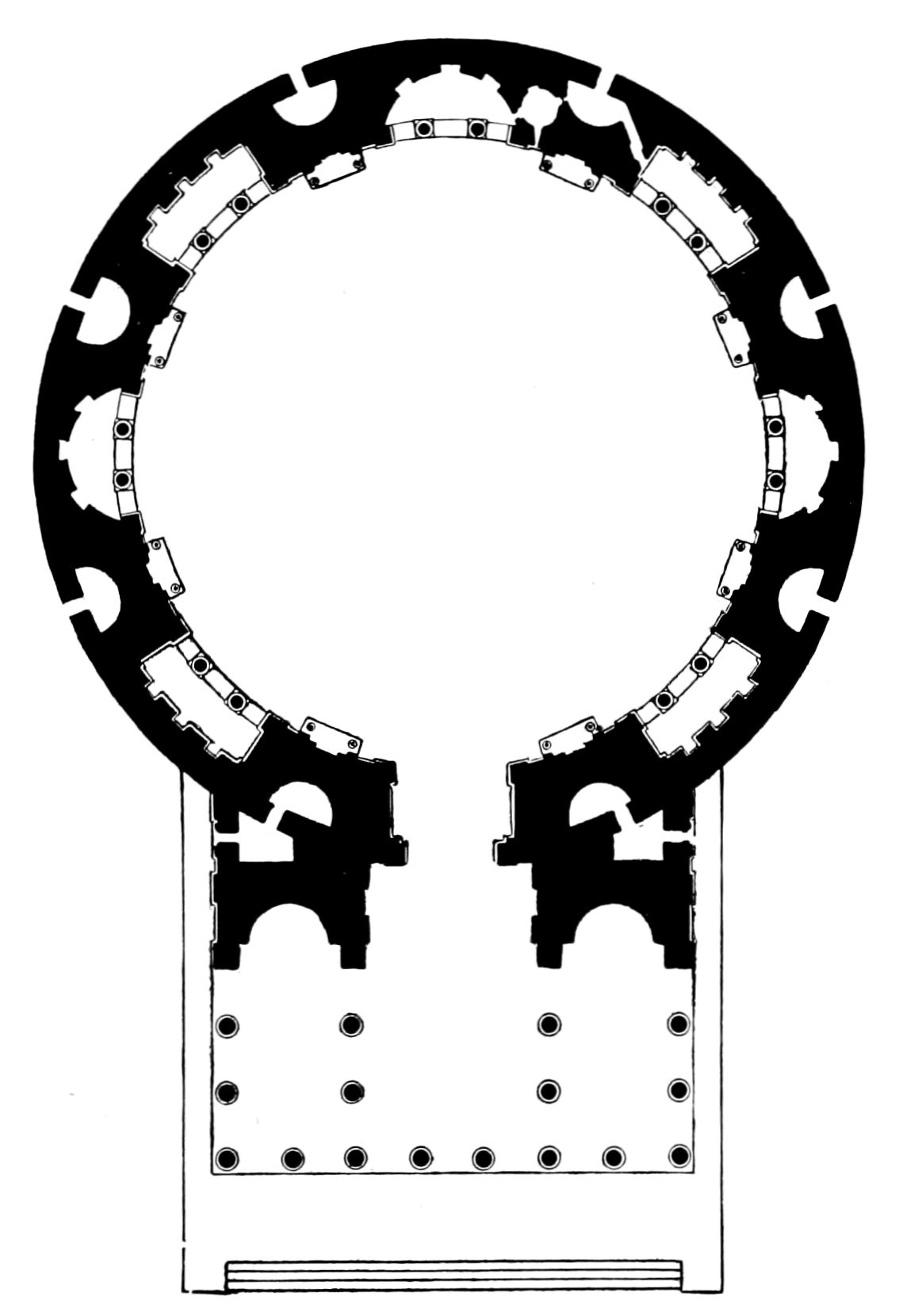 Michael Angelo, who designed the dome, wished to adopt the plan of the Greek cross, that is, with equal arms, as shown in the accompanying plan. The result would have been much more monumental and would have given the dome its due effect within a moderate distance, while now it can only be properly judged from afar, and the high façade terminating the nave is both poor in composition and detrimental to the general conception. The building is essentially Classic in all its details, but differs from the general design of any particular Classical building. The nave is formed by a Corinthian arcade similar to those of ancient Rome, though on a vastly larger scale, supporting a tunnel-vault, which is decorated with sunken panels like those of the ancient Baths. The dome is supported on a circular drum carried on four immense piers and improves on the Pantheon only in size, while it is surpassed by St. Sophia in scientific construction.