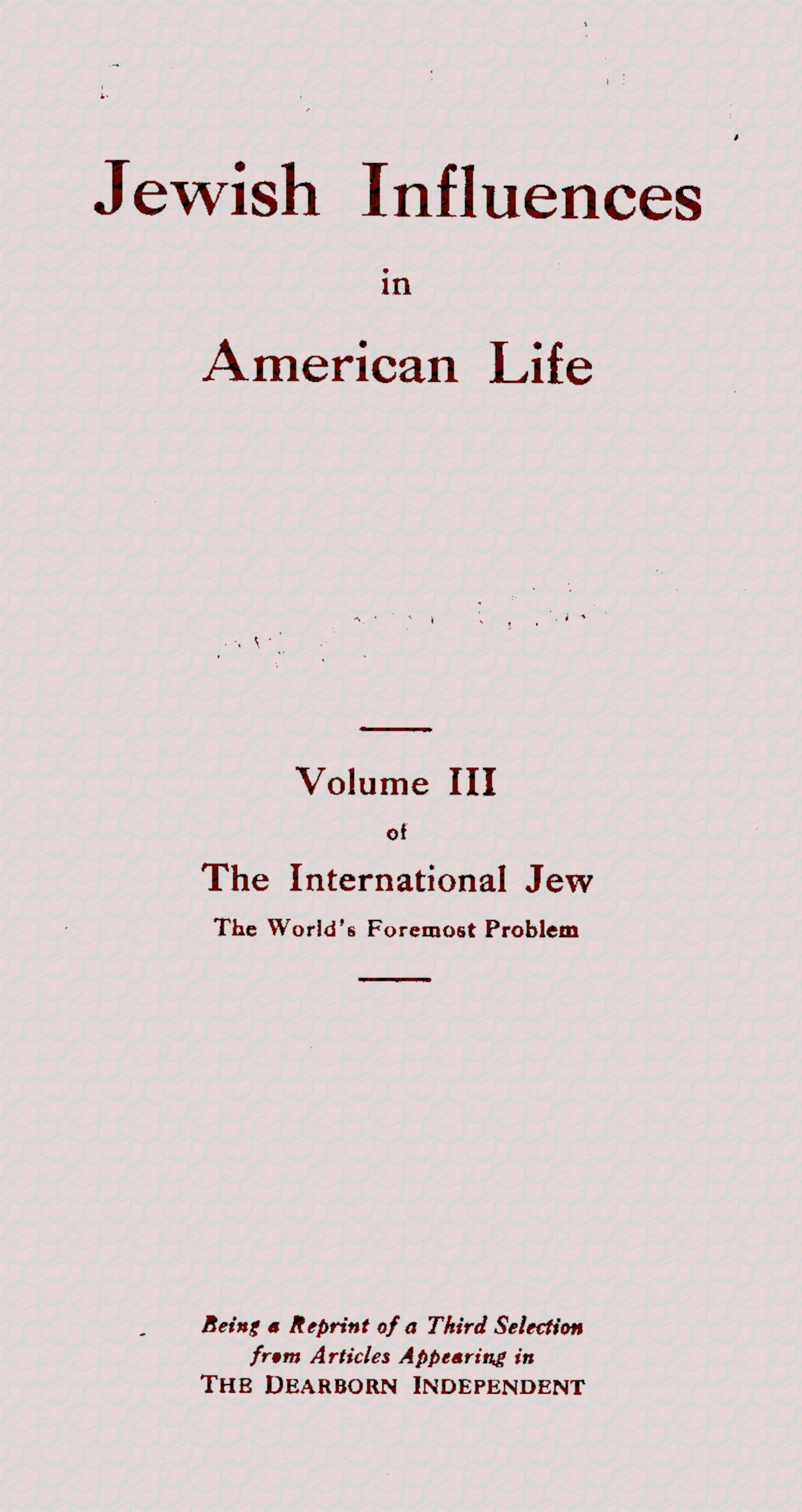This volume contains information dealing with the influence of the Jewish idea on American life. The departments of life here studied do not by any means exhaust the list. The studies are more and more centering on the actual operations of the Jewish program upon the American people, and the effect of Jewish conceptions on our common life. These studies are appearing in The Dearborn Independent now. They will be gathered into future volumes as may be required.