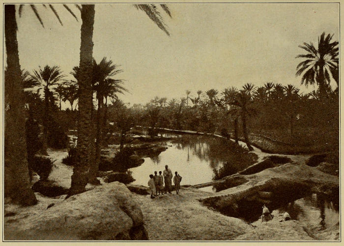 Because in the geographies of our school-days large portions of North Africa were painted a speckled yellow, and because of the pictures of sand-dunes reproduced in certain magazines, we habitually picture the Sahara as a trackless waste of orange sand, on which grows no living thing, little realizing that it is broken by mile-high mountain ranges and dotted with oases, some of them as large as a New England State, which support thousands of inhabitants and millions of date-palms.